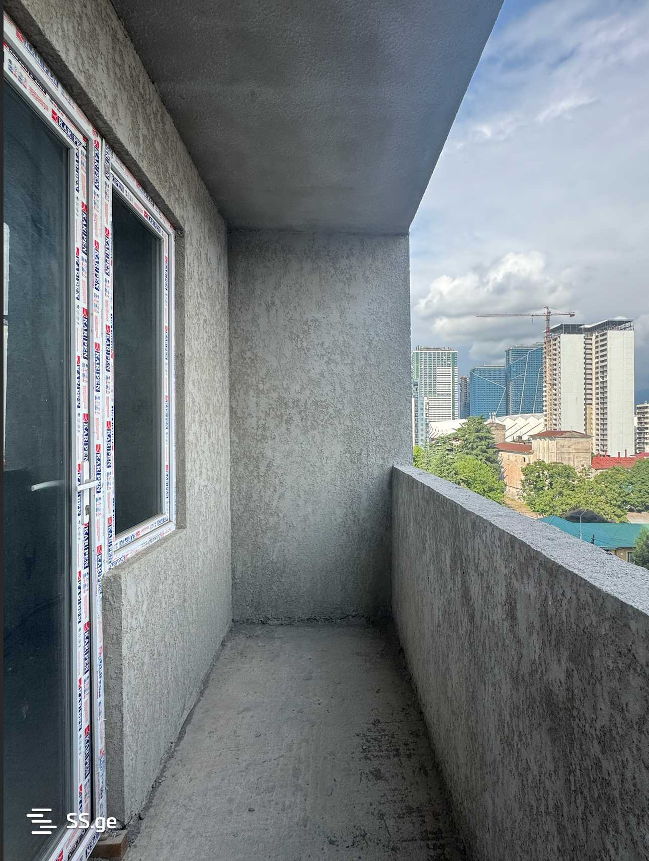 ვრცელი აივანი გადის აბუსერისძის ქუჩაზე და უყურებს ახალ სტადიონს, წინ არის ხედები მთაზე. ნათელი და მზიანი მხარეა.