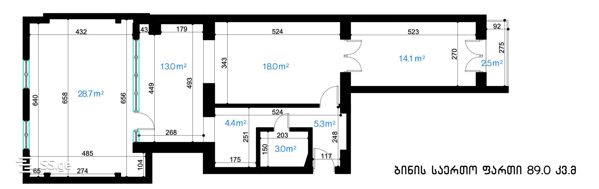 29 მ² შავი კარკარის მქონე ოთახი, ჩასმული მეტალოპლასტმასის კარფანჯრით, თავისუფალი დაგეგმარება. შესაძლებელია გაკეთდეს ორი დამატებითი საძინებელი (სულ 3 გამოვა) ან große სტუდიოს ტიპის მისაღები და სამზარეულო. ბინა ნათელია, აქვს ხედი როგორც ეზოს, ისე ქუჩის მხარეს (აივანი). დამონტაჟებულია ახალი მაღალი კლასის კონდინციონერი.