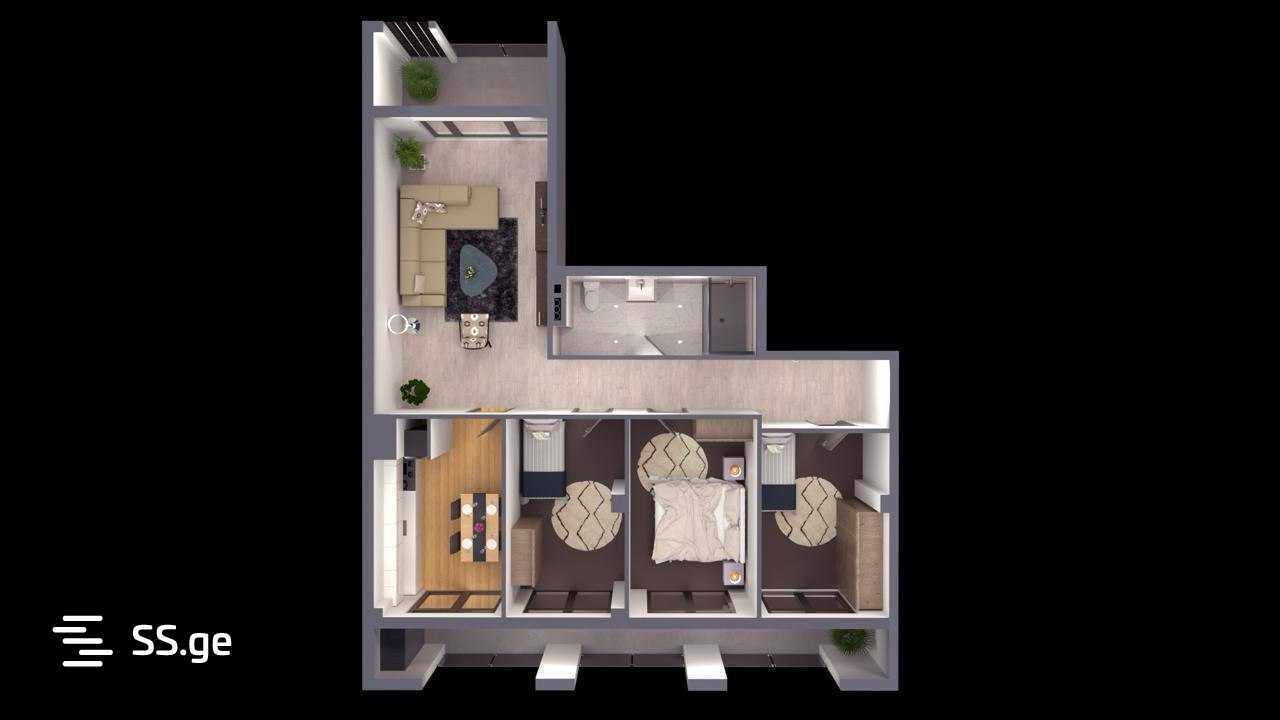 აღნიშნულ ბინა აქვს 3 იზოლირებული საძინებელი და ერთი საკმაოდ დიდი მისაღები რომლების გასასვლელი აქვს ყველა აივანზე