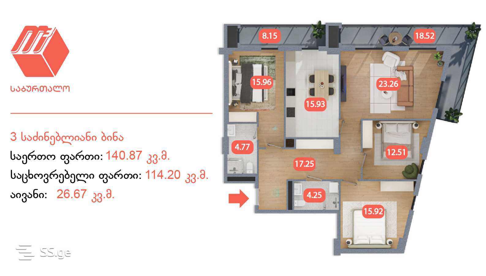 იყიდება 3 საძინებლიანი მშენებარე ბინა 140.87 კვ.მ. ორი სველი წერტილით, მისაღები ოთახით და იზოლირებული სამზარეულოთი, დიდი აივნით, რომელიც თითქმის გარს ერტყმის მთელ ბინას, 3-ე სართულზე, თბილისის ცენტრალურ ნაწილში, მარშალ გელოვანის გამზირსა და ბაქრაძის ქუჩას შორის, m²-ის ახალ საცხოვრებელ უბანში, რომელიც ვეფხი და მოყმის ძეგლიდან 900 მეტრში მდებარეობს. პროექტის მშენებლობა დასრულდება 2026 წელს. პროექტი ბარდება თეთრი კარკასი. (პროექტის გადაკეთება და ტიხრების გადანაცვლება შესაძლებელია, უკვე ამოყვანილია 3 სართული)