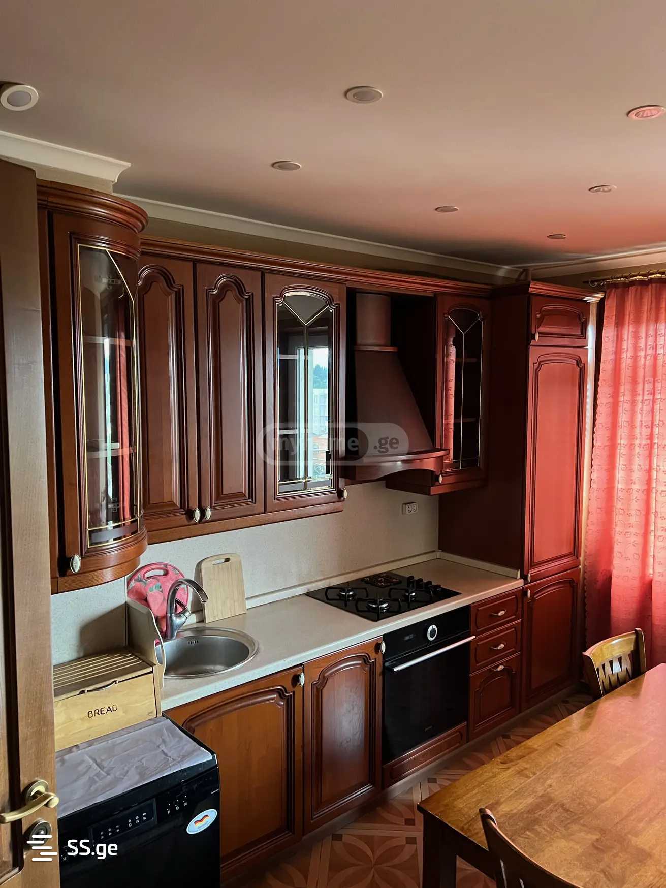 სამზარეულოში დამონტაჟებულია კაკლის ხისგან დამზადებული იტალიური სამზარეულო.
