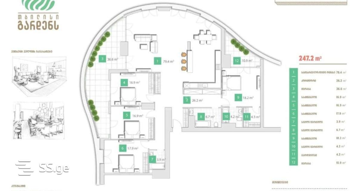 თბილისი გარდენსში (Tbilisi Gardens) იყიდება 247 კვ/მ ბინა, 28ე სართულზე (გამოდის 4 საძინებლიანი ბინა), მწვანე კარკასის მდგომარეობაში. აქვს პანორამლული ხედი თბილისზე.რაც შეეხება კომპლექსს: სახლი მდებარეობს ულამაზეს, მყუდრო , ლამაზად გამწვანებულ და მოვლილი პარკის შუაგულში. თბილისი გარდენსის საცხოვრებელი სივრცე დაცვის განსაკუთრებული სერვისით გამოირჩევა. სრული ტერიტორია არის 38 000 მ² საიდანაც 21’000 მ²ი არის ცენტრალური პარკი, რომლის გამწვანებაზეც იტალიელი დიზაინერები მუშაობენ. თქვენს განკარგულებაში იქნება: ოლიმპიური და საბავშვო აუზები, საბავშვო მოედანი, სავარჯიშო დარბაზი, მიწისქვეშა პარკინგი, ლობი, კონსიერჟის სერვისი და ბიზნესლაუნჯი.