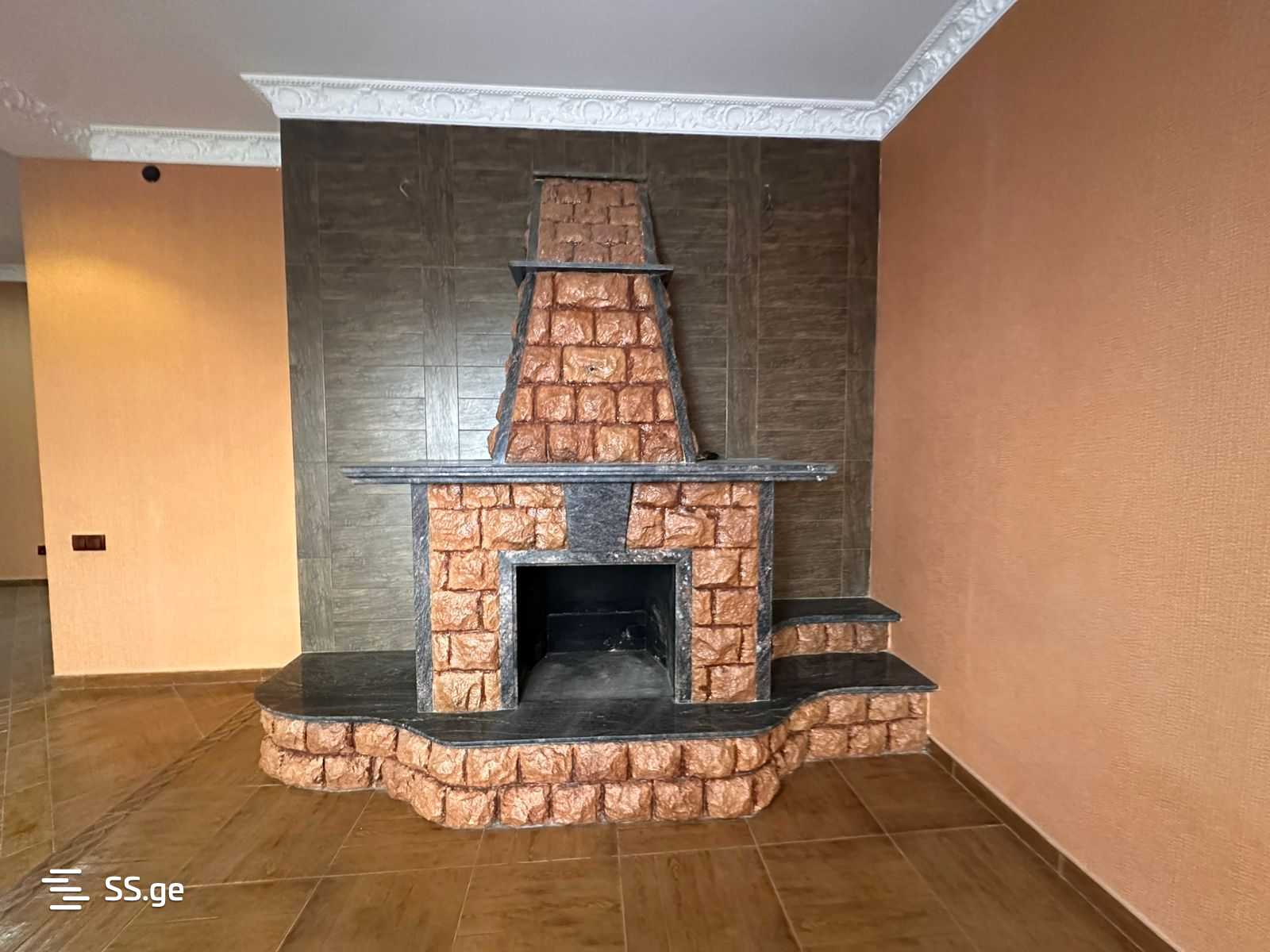 დიდი მისაღები ბუხრით და აივნით, იატაკზე დაგებულია კერამიკა