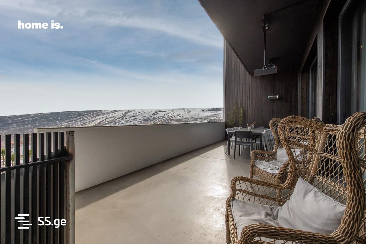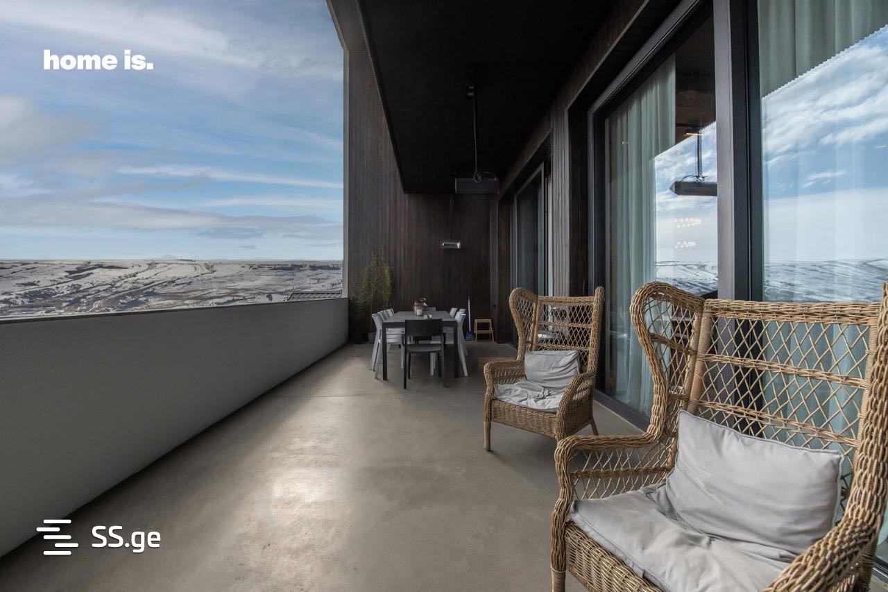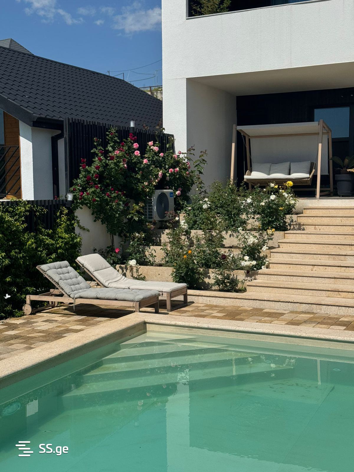 სახლი მოიცავს — 6 საძინებელს, 5 სველ წერტილს, 2 მისაღებს, სამზარეულოს, 2 კაბინეტს, 2 სათავსო ოთახს, სამრეცხაოს, 2 ვერანდას, 1 აივანს, აუზის ტექნიკურ ოთახსა და ავტოფარეხს, რომელიც 3-4 მანქანაზეა გათვლილი. მაქსიმალური პრაქტიკულობისა და კომფორტის უზრუნველსაყოფად კი ოთახები სამ სართულზე ოპტიმალურად არის გადანაწილებული.