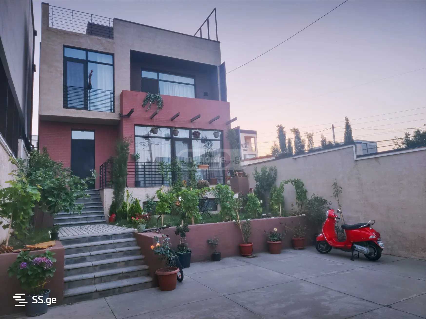 პირველი სართულიდან გავდივართ გამწვანებულ ეზოში: გაზონი, დეკორატიული მცენარეები, ხეხილი...