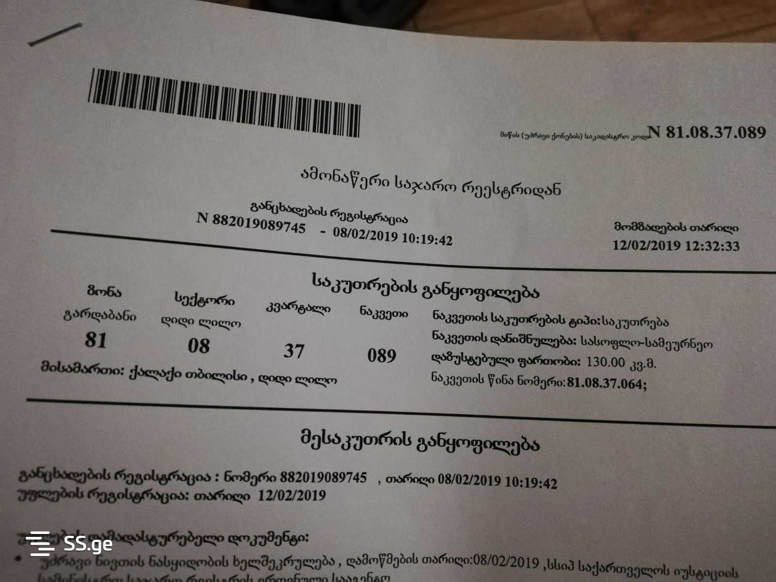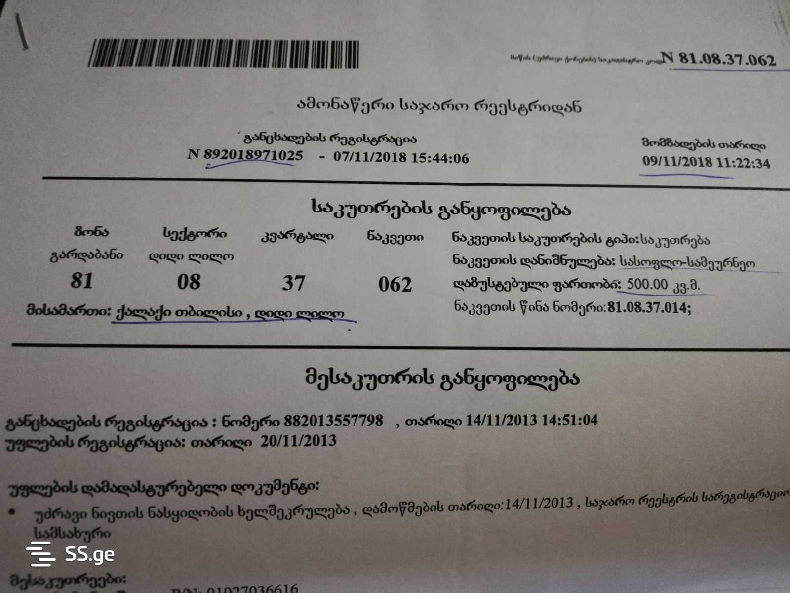 იყიდება ქ.თბილისი დიდი ლილო, ტერიტორიაზე 2 მიწის ნაკვეთი 500 კვ.მ და 130 კვ.მ (ყოფილი გარდაბნის რ–ნში, სოფელი "პატარა ლილოში") ნაკვეთები ცენტრალური გზიდან 300 კმ–შია, შესაძლებელია გაერთიანებაც. ნაკვეთში მიყვანილია წყალი და დენი. ირგვლივ მიმდინარეობს განაშენიანება. საწყისი ფასი 41.000 (ორმოცდა ერთი ათასი ) აშშ $;