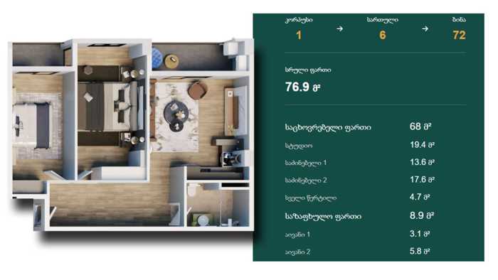 მეგას კომპლექსში იყიდება 3 ოთახიანი ბინა 2 საძინებლით