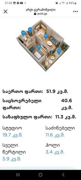 - იყიდება 2-ოთახიანი ბინა Alpha House-ში, შეშელიძის ქ. 18, B ბლოკი. - ფართობი: 47.1 მ² - სართული: მე-10 და მე-18 - ოთახების რაოდენობა: 2 - ჭერის სიმაღლე: 3 მ - ბინა არის თეთრი კარკასის მდგომარეობაში: - გალესილი კედლები, მოჭიმული იატაკი - მეტალო-პლასტმასის კარ-ფანჯარა - რკინის შესასვლელი კარი - მიყვანილია ბუნებრივი აირი და ელექტროენერგია - მოპირკეთებული აივანი და სადარბაზო - კომუნალური აბონირება დასრულებულია იდეალური ვარიანტია როგორც გასაქირავებლად, ასევე სტუდენტებისთვის. - სააგენტოებს გთხოვთ, ნუ დამიკავშირდებით.
