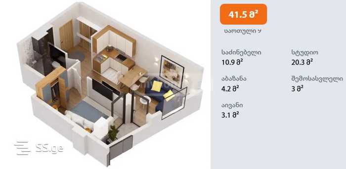 იყიდება 41.5 მ² ნათელი ბინა ვაშლიჯვარში, თოფურიძის ქუჩაზე, ახალაშენებულ კორპუსში (მწვანე კარკასი). საუკეთესო ხედებით. გეგმარება: • საძინებელი – 10.9 მ² • სტუდიო მისაღები – 20.3 მ² • აბაზანა – 4.2 მ² • შემოსასვლელი – 3 მ² • აივანი – 3.1 მ²