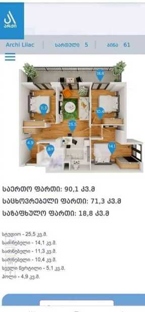 საერთო ფართი - 117.1 კვ.მ. საცხოვრებელი ფართი - 75.7 კვ.მ. საზაფხულო ფართი - 41.4 კვ.მ. A ბლოკი დეტალური ინფორმაციისთვის დამიკავშირდით