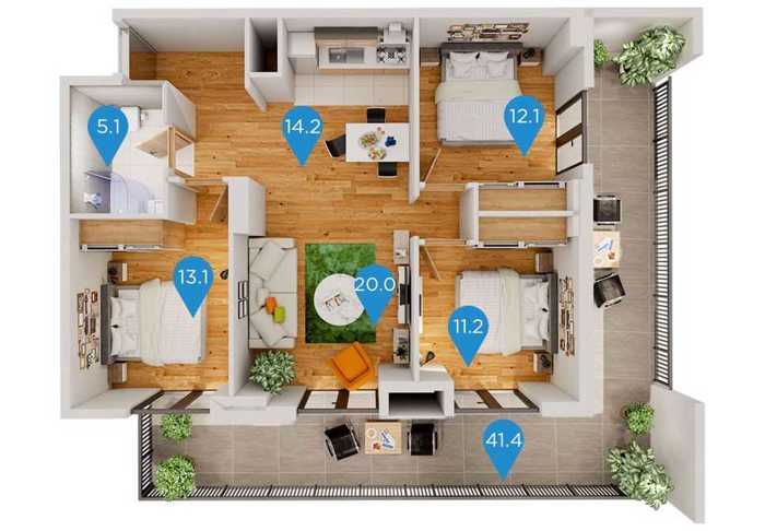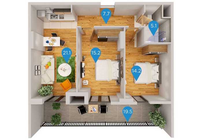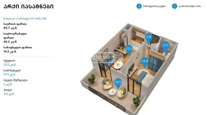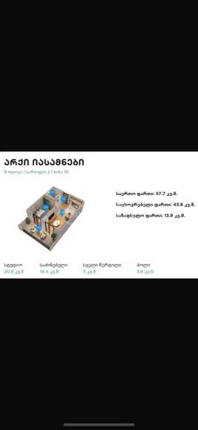საერთო ფართი - 79.8 კვ.მ. საცხოვრებელი ფართი - 57.9 კვ.მ. საზაფხულო ფართი - 21.9 კვ.მ. A ბლოკი დეტალური ინფორმაციისთვის დამიკავშირდით