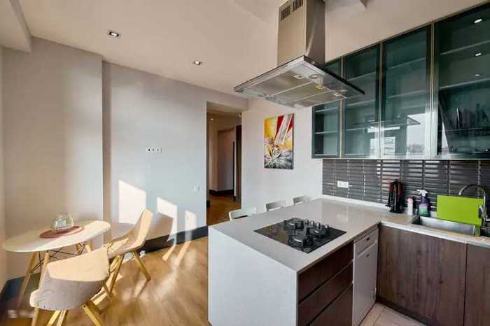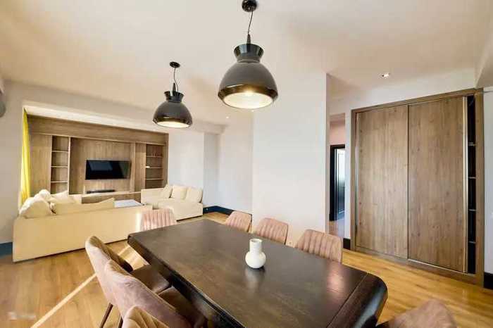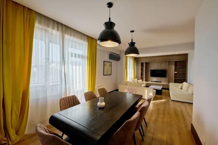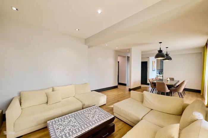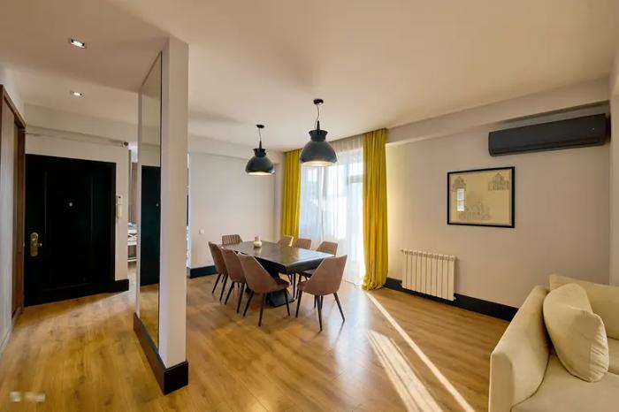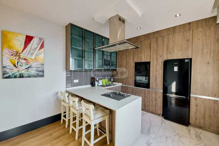 სამი საძინებელი, ცალკე სამზარეულო, მისაღები, სამი აივანი, ორი სველი წერტილი. საბურთალო, გაგარინის და შარტავას კვეთაზე.