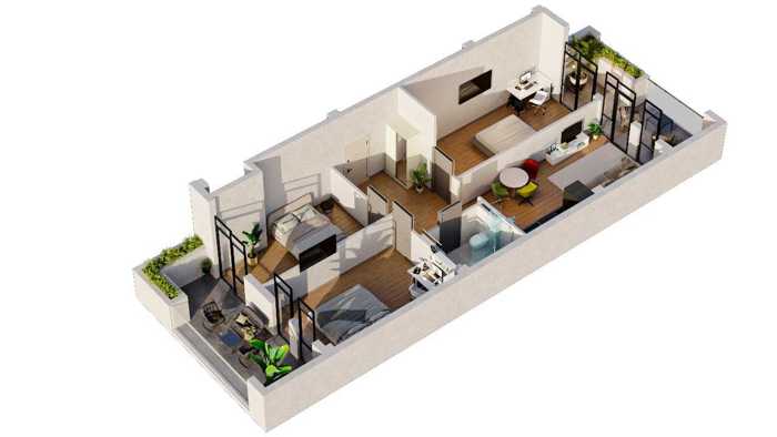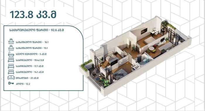იყიდება სამშენებლი კომპანიისგან ბინა !!! კორპუსი არის ექვსბინიანი. ბინა არუს მწვანე კარკასი, პირველ სართულზე 155 მ² + 20 მ² საზაფხულო ტერასა საჩუქრად!!! გეგმარება მოიცავს 3 ოთახს, მათ შორის 2 საძინებელს, 2 სველი წერტილს და იზოლირებულ სამზარეულოს. სურვილის შემთხვევაში შესაძლებელია გადაგეგმარება და მესამე საძინებლის დამატება. ვიტრინული კარფანჯარა. კორპუსს აქვს მწვანე ეზო და მიწისქვეშა ავტოფარეხი. იჩქარეთ, ყველა ბინა გაყიდულია, დარჩა მხოლოდ 2, პირველ და მესამე სართულებზე.