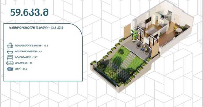 დასრულებულ პროექტში, ლისის ტბის წიწვოვანი ტყის პირას, იყიდება ბინა საკუთარი ეზოთი, ჭერის სიმაღლე 3.75მ; პროექტი შესრულებულია მაღალი ხარისხის სამშენებლო მასალით, აქვს თანამედროვე ინფრასტრუქტურა, მიწისქვეშა პარკინგი ელექტრომობილების დატენვის სისტემით, ლიფტი, რეკრეაციული ზონა წიწვოვან ტყეში.
