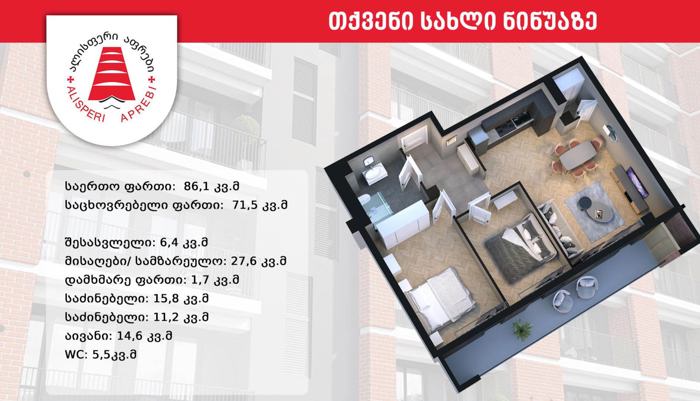 ეძებთ ხელმისაწვდომ სამოთახიან ბინას ახალ კორპუსში? ნინუას ქუჩაზე, გოცირიძის მეტროდან ფეხით სავალ მანძილზე, 12 სართულიანი ახალაშენებული კორპუსის ბოლო სართულზე იყიდება ბინა ს/ფართი 86.1 კვ.მ. ბინა გათვლილია კლასიკურ ევროპულ სტილში: სამზარეულო შერწყმულია მისაღები ოთახთან, რაც საშუალებას გაწვდოს დრო ოჯახთან ერთად ფართო საერთო სივრცეში, ხოლო დერეფნის გასწვრივ არის ორი ცალკე საძინებელი, სადაც შეგიძლიათ სიმყუდროვეში განცალკევება. ყველა ოთახის აივნების წყალობით, საიდანაც იშლება შესანიშნავი ხედი ქალაქზე, ბინა არის ძალიან ნათელი. ამ დროისთვის სახლის მიმდებარე ტერიტორია კეთილმოწყობილია. უკვე აშენდა ასფალტის გზა, კორპუსს მიმდებარედ აქვს ავტოსადგომი (შენობას ასევე აქვს მიწისქვეშა პარკინგი) და ძალიან მალე იქნება პარკიც, სადაც შეგიძლიათ იაროთ და დატკბეთ ბუნებით და სიჩუმით თითქმის ცენტრში ქალაქი. წერეთლის გამზირის რეაბილიტაციის წყალობით, სატრანსპორტო გადასასვლელი ბევრად უფრო მოსახერხებელი გახდა და მგზავრობის მიმართულებიდან გამომდინარე, შეგიძლიათ გამოიყენოთ გზის რამდენიმე ვარიანტი.