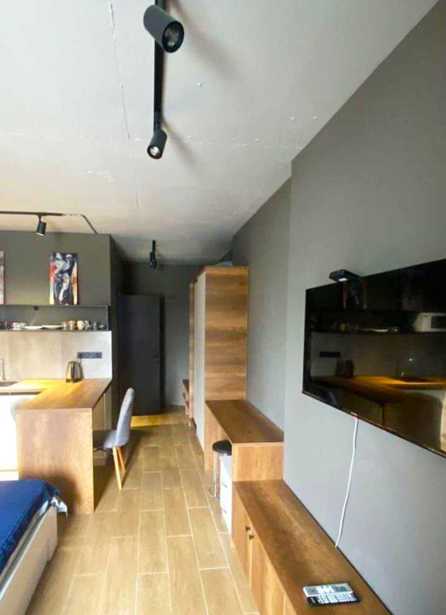 შავი ჩარჩოს აპარტამენტი დასახლებულ სახლში, ხელსაწყოები გააკეთე და იცხოვრე, ან ქირავნობა, ფართო, მყუდრო სტუდია, კარგი ინფრასტრუქტურა ზღვის ახლოს, სუპერმარკეტი საუკეთესო ბათუმში