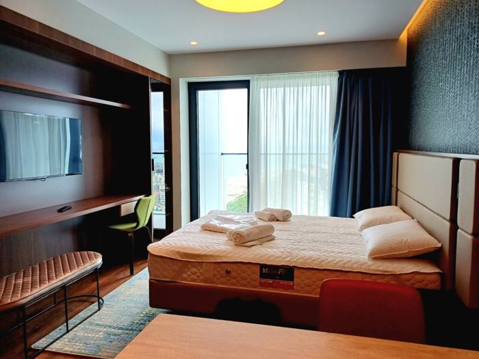 ქირავდება სტუდიპს ტიპის ბინა მარიოტში, 27-ე სართულზე, 57-სართულიანი კორპუსიდან. ბინის საერთო ფართობი შეადგენს 36 კვ.მ-ს და მოიცავს ერთ ოთახს და ერთ საძინებელს. ბინას აქვს ერთი აივანი, საიდანაც იშლება ქალაქის ულამაზესი ხედები. თანამედროვე სტანდარტებით აშენებული ბინა უზრუნველყოფს სიმშვიდესა და კომფორტს. ახალი გარემო და მაღალი სართული ქმნის განსაკუთრებულ ატმოსფეროს, სადაც შეგიძლიათ იგრძნოთ ქალაქის პულსი და დატკბეთ სიმყუდროვით. ბინა იდეალურია მათთვის, ვისაც სურს განიცადოს თანამედროვე ცხოვრების სტილი ახალ გარემოში.