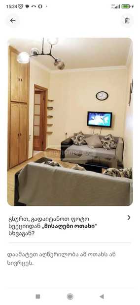 კეთილმოწყობილი ბინა საჭირო ავეჯით და ტექნიკით, სამზარეულოს ინვენტარით. ცენტრალური გათბობით, კონდიციონერი, ტელევიზორი, მაცივარი, სარეცხი მანქანა. სუფთა და მოწესრიგებული ბინაა. საძინებელი არ აქვს ცალკე, სამზარეულო ცალკეა 2 თვის წინასწარი გადასახადით