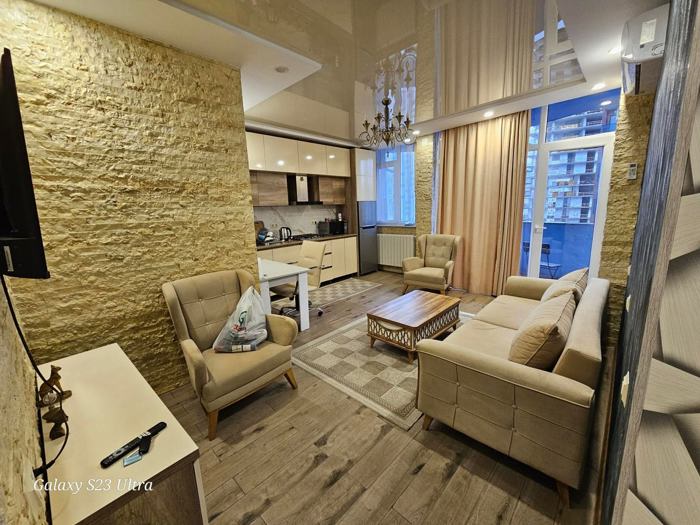 დავის მთლიანი თანამედროვე აპარტამენტი - შესანიშნავი ვარიანტი ოჯახისთვის ან დიდი კომპანიისთვის. ხედვა თურქეთზე! აპარტამენტში არის ყველაფერი კომფორტული ცხოვრებისათვის: ქინგ-მზიდი ორსაწოლიანი საწოლი; გაწვდილი დივანი (დამატებითი საწოლი ადგილისთვის); ორი ტელევიზორი; ორი კონდიციონერი; აღჭურვილი სამზარეულო; დიდი მაცივარი; სარეცხი მანქანა; თმის საშრობი. აპარტამენტი ხელმისაწვდომია аренდისათვის როგორც მოკლევადიანი, ასევე გრძელვადიანი.