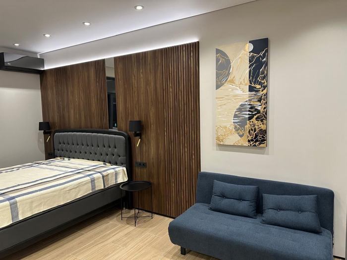 ქირავდება ახალაშენებული, არასტანდარტული პროექტის ბინა 21-ე სართულზე, 25-სართულიან კორპუსში. ბინის საერთო ფართობია 50 კვ.მ, მოიცავს 2 ოთახს, მათ შორის 1 საძინებელს და 8 კვ.მ ფართობის სამზარეულოს. ბინაში არის ნათელი მისაღები ოთახი, დიდი ფანჯრებითა და მინის კარით, რომელიც გადის აივანზე. ინტერიერში გამოყენებულია ხის იატაკი, რაც სიმყუდროვესა და სითბოს მატებს სივრცეს. ბინაში განთავსებულია სველი წერტილი, სარეცხი ოთახი და კომფორტული ჰოლი. თანამედროვე დიზაინი და დიდი ფანჯრები უზრუნველყოფს ბუნებრივ განათებას და სასიამოვნო ატმოსფეროს.
