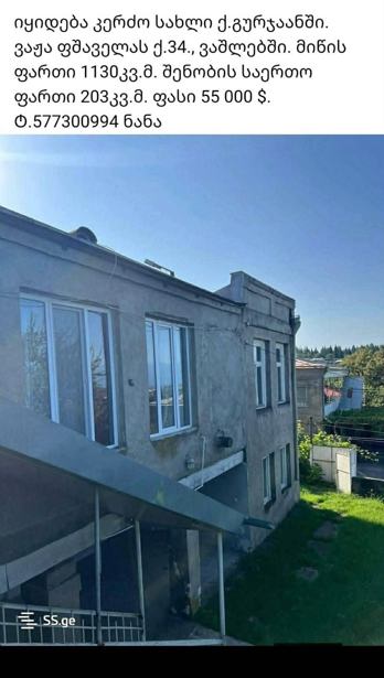 იყიდება კერძო სახლი ქ.გურჯაანში. ვაჟა ფშაველას ქ.34., ვაშლებში. მიწის ფართი 1130კვ.მ. შენობის საერთო ფართი 203კვ.მ. ფასი 55 000 $.