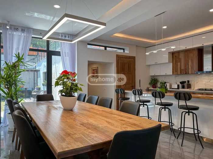ეს არის უნიკალური თანამედროვე დიზაინის ჭკვიანი კერძო სახლი, რომელიც მოიცავს: ორ საცხოვრებელ ზონას, 5 საწოლიან ოთახს, აუზს, საუნას, წინა და უკანა ეზოს შიდა პარკინგით ორი მანქანისთვის. სკოლებიდან 5 წუთის სავალზე. იდეალურად მდებარეობს კაკლებს და წყნეთს შორის. აშენებულია ესპანური ფილებით, იატაკის გათბბით და Roca-ს აქსესუარებით. ყველა კარი და კარადა დამზადებულია ნამდვილი . სამივე სართულს აქვს ცალკე ბუხარი. სპორტული დარბაზი და სასწავლო/მოახლის ოთახი. აუზი მოზაიკის დიზაინით და გარე საშხაპე. სახლი მთლიანად აღჭურვილია მაღალი კლასის ავეჯით, ცალკე ბარი და სამზარეულოთი, კინოს ოთახი პროექტორით. ყველა ფანჯრის საფარი ესთეტიურად შესრულებულია იმპორტირებული ფარდებით, წინა და უკანა ეზოს ავეჯის ჩათვლით. Mian ტერასას აქვს ულამაზესი ჩანჩქერი და ორივე ლაუნჯს აქვს 85 და 70 დიუმიანი LED ტელევიზორები და მე-3 LED ტელევიზორი მბრუნავი კედლით მოთავსებულია მთავარ საწოლ ოთახში. აღჭურვილია ორთქლის საუნა და სპორტული დარბაზი. მეპატრონისა და სტუმრების აბანოები აღჭურვილია როგორც საშხაპე, ასევე ჯაკუზის აბანოებით. ფართომასშტაბიანი ღია სამზარეულო აშენებული ნამდვილი ხით და ყველა აქსესუარით/აღჭურვილობით, მათ შორის ჩაშენებული მიკროტალღური ღუმელით, გაზქურით, ორკარიანი მაცივრით და ჩაშენებული ჭურჭლის სარეცხი მანქანასთან ერთად ცალკე, დახურულ სამუშაო სამზარეულოსთან ერთად. კონცეპტუალურად შემუშავებული, დივერსიფიცირებული და კომფორტული ჭკვიანი ვილა, აშენებული მაღალი ხარისხისა და ესთეტიკის გათვალისწინებით, რომელიც ქმნის ჰარმონიის განცდას და საუკეთესო ადგილს საღამოს განტვირთვის, რაც დაუვიწყარია. • სტატუსი: საკუთარი სახლი • აშენებული საცხოვრებელი ფართის ზომა (კვ.მ): 312 • ეზოს ფართობი: 200 (კვ.მ) • სართულები: 3 • ოთახები: 8 (საძინებელი 5) • სველი წერტილები: 5 • სამზარეულო: 2+1: დიახ • სრულად აღჭურვილი 3 LED-ით • მდგომარეობა: ახალი აშენებული და გარემონტებული • გათბობის იატაკი: დიახ. • საცურაო აუზი გათბობით: დიახ • ორთქლის საუნა: დიახ • აივანი: დიახ • ვერანდა: დიახ • საცავი, სარდაფი, ცალკე საკუჭნაო/სამრეცხაო. • ტელეფონი: დიახ • კონდიციონერი: დიახ • ცხელი წყალი, ცენტრალური გათბობის სისტემა: კი • გათბობა, ცენტრალური გათბობის სისტემა: კი • ინტერნეტი: დიახ • ავეჯი დიახ • გარდერობი: დიახ • ბუხარი (3) • ეზო: კი • პარკინგი, პარკინგი • აუზი: დიახ