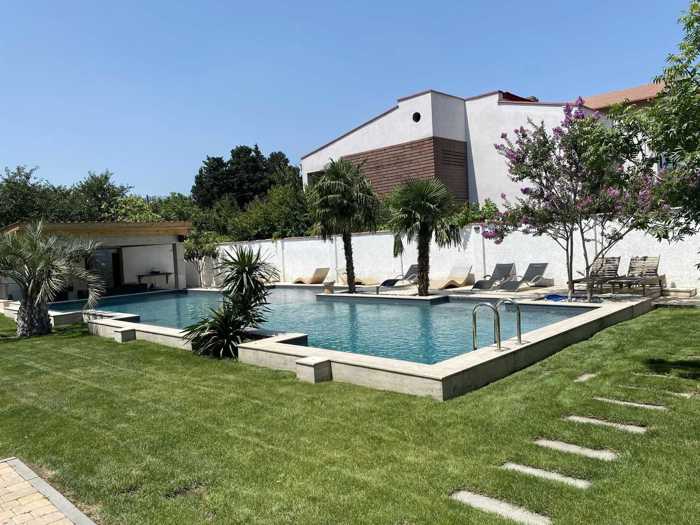 საერთო ფართით- 367.68 კვ.მ მათ შორის საცხოვრებელი ფართი-200.13 კვ.მ საზაფხულო ფართი-59.45 კვ.მ, მანსარდის ფართი 72.45 კვ.მ კიბის უჯრედისა და სადარბაზოს ფართი-35.65 კვ.მ. რაც მოიცავს შემდეგ გეგმარებას: პირველ სართულზე: სამზარეულო სასადილო სივრცით ვიტრაჟული ტიპის. დიდი მისაღები და ბუხრის ოთახი. 2 სველი წერტილი და 1 ტექნიკური ოთახი. ჰოლი დიდი ჩაშენებული კარადებით. ღია ტერასა 25 მ2. მეორე სართულზე: დიდი მისაღები ოთახი. 4 საძინებელი აქედან 1 მასტერბედრუმი გარდერობით. დანარჩენი 3 საძინებელი ყველა საკუთარი სველი წერტილებით. ფრანგული აივნებით. მესამე სართული მანსარდული ტიპის, მოწყობილია დიდი კაბინეტი, სატრენაჟორო ოთახი, თავისი სველი წერტილით. პირველ სართულზე გაკეთებულია მაღალი ხარისხის რემონტი, თანამედროვე დიზაინში გადაწყვეტილი ფერთა გამა. არის ვიტრაჟული ტიპის, დამონტაჟებულია ალუმინის სლაიდ სისტემების ვიტრაჟები. ვიდეოკამერები სრულ პერიმეტრზე. ეზოს საერთო ფართობი: 1226 კ.მდე. ბლოკის გალავნით შემოღობილი. პულტირებული ჭიშკრით. გამწვანება გაკეთებული თავისი ავტომატური სარწყავი სისტემით. დეკორატიული იშვიათი ხე-მცენარეებით მორგული. ავტომატური განათების სისტემა, მთელი ეზოს პერიმეტრზე. გაკეთებულია ულამაზესი აუზი ზომები: 17/5-ზე, სიღრმე 1,60მ. თავისი განათებებით. ეზოში ასევე მოწყობილია ბარბექიუს სივრცე. ბარი სველი წერტილით და გასახდელით. ბარის ქვეშ 20მ2. მარანი, ვიტრაჟული შუშის ჭერით. აუზის დანადგარების ტექნიკური ოთახი და ავტოფარეხი 1 მანქანაზე და გათბობის ტექნიკური ოთახით. სტატუსი მიწის არის არა-სასოფლო.