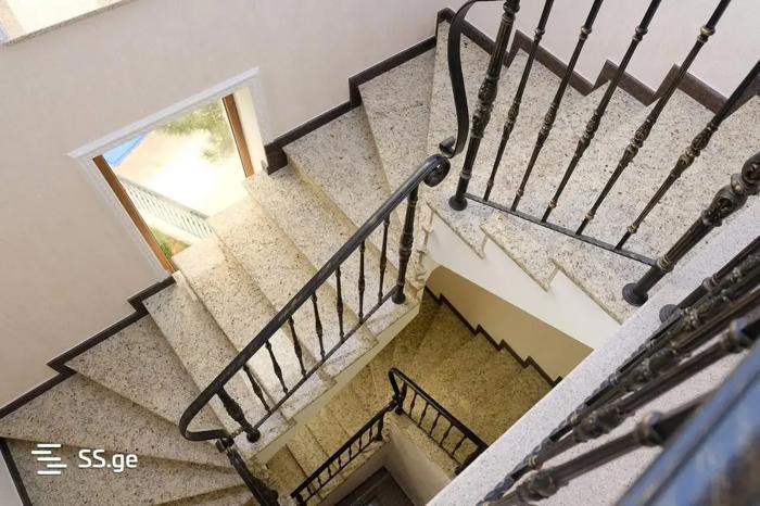 თანამედროვე კერძო სახლი პრემიუმ ლოკაციაზე 📍 მდებარეობა: ნაკვეთი მდებარეობს მთაწმინდიდან 14 წუთის სავალზე. უკანა მხარეს ესაზღვრება ხევი 100-წლიანი მუხებით, რაც ქმნის და ბუნებრივ გარემოს. შესაძლებელია მეზობელი ნაკვეთის მიერთებაც. 📐 პროექტი: დამტკიცებული გრგ-ით, ორსართულიანი სახლი + ცალკე მდგომი აუზი. • I სართული: მისაღები, სამზარეულო, 2 საძინებელი, ს/ც, ტექნიკური ოთახი • II სართული: მასტერ-ბედრუმი, ს/ც, მისაღები, პანორამული ვერანდა ◼ შენობა – 256 მ² ◼ საზაფხულო სივრცე – 90 მ² ◼ ნაკვეთი – 743 მ² ვიტრაჟები უზრუნველყოფს ბუნებრივ განათებას და ფართეს. სახლს აქვს ორი შესასვლელი.