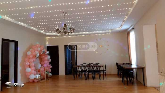ქირავდება სახლი დღიურად წვეულებებისათვის სახლის ფართი 460 m2 ეზოს ფართი 1500 m2 სახლი შედგება: 3სართული 3 საძინებელი ოთახი 3 სვ.წერტილი დახურული ვერანდა ღია ვერანდა აღჭურვილია: საცეკვაო ფართი ლაზერებით (0სართული) პროფესიონალი დინამიკი ბუხარი მაყალიშამფურები ხმაურზე შიდა ფართში (0სართულზე) შეზღუდვა არ არის ჯავშნებისთვის დაგვირეკეთ