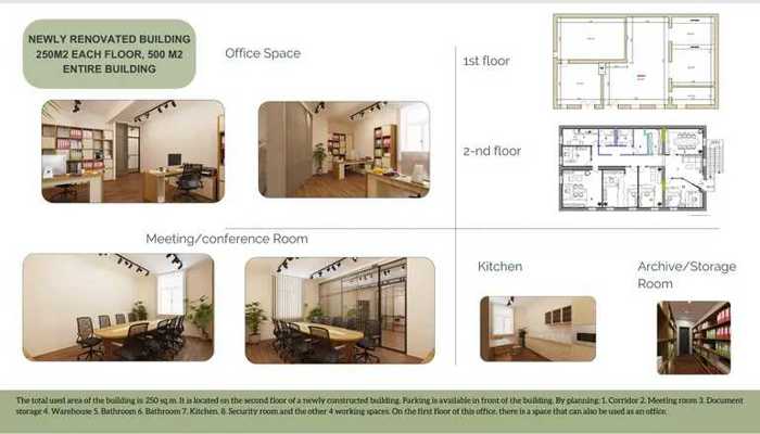 ქირავდება! პრემიუმ კლასის საოფისე ფართი კრწანისში, ბევრიეთის ქუჩაზე! 1920 მ² თანამედროვე, ცალკე მდგომი კომფორტული და ნათელი სამუშაო სივრცე! სართული: 638.10 მ2, მეორე სართული 643,40 მ2, 3 სართული: 638,10 მ2. აღნიშნული ფართი არ მოიცავს პარკინგის სივრცეს და ტერასას. 3 სართულიანი შენობა – მაქსიმალური სივრცე თქვენი ბიზნესისთვის! ვიტრაჟული ფასადი – ბუნებრივი განათება მთელი დღის განმავლობაში. მიწისქვეშა პარკინგი 48 ავტომობილზე – დამატებითი კომფორტი თანამშრომლებისა და სტუმრებისთვის. ლიფტი და ორი კიბის უჯრედი – მოსახერხებელი გადაადგილებისთვის. შესაძლებელია ადაპტაცია ოფისისთვის, კლინიკისთვის, ტრენინგ ცენტრისთვის, სპორტული დარბაზისთვის და სხვა კომერციული მიზნებისთვის. ამჟამად, მიმდინარეობს ფასადის მოპირკეთება, გთავაზობთ რემონტისთვის საშეღავათო პერიოდს! დამატებითი ინფორმაციისთვის და დასათვალიერებლად დაგვიკავშირდით!