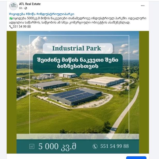 იყიდება ლილოდან ორ კილომეტრში, დიდ ინდუსტრიულ ზონაში მიწის ნაკვეთი. სადაც მიმდინარეობს საბაჟო ტერმინალების მშენებლობები, სასაწყობე და საწარმოო ფართების მშენებლობები, ფარმაცევტული კომპანიების საწყობები, შესაძლებელია კვადრატულობის მომატება.