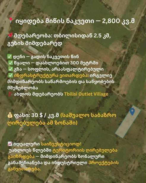 სასწრაფოდ! იყიდება მიწის ნაკვეთი 5,000 მ²-დან! 📍 მდებარეობა: • ლილოსა და რუსთავს შორის ცენტრალური გზის მიმდებარედ • გზიდან მხოლოდ 800 მეტრი • კომუნიკაციები ადგილზე: გაზი, დენი, წყალი • თბილისი აუთლეტ მოლიდან და გეზიდან – დაახლოებით 5 კმ 🔶 ნაკვეთი იდეალურია: • საწყობისთვის • საწყობისთვის • ნებისმიერი ტიპის კომერციული საქმიანობისთვის შესანიშნავი ლოკაცია ბიზნესის დასაწყებად ან გასაფართოებლად! დამატებითი ინფორმაციისთვის დაგვიკავშირდით.
