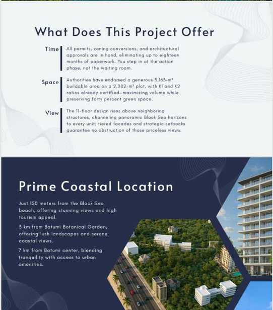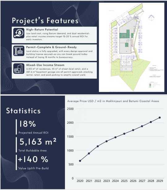 მახინჯაურის მიწა არის მზად-ბაღი ზღვისპირა ნაკვეთი, რომელიც ფასით გადაახლებული აქვს ბატუმში სხვა სანაპირო ნაკვეთებთან შედარებით. ყველა დოკუმენტი დამტკიცებულია, რაც ნიშნავს, რომ ნებართვების ელოდოთ არ მოგიწევთ. ეს დრო და სტრესი გადაარჩენს. ყველა ნებართვა, ზონირების გარდაქმნა და არქიტექტურული დამტკიცებები ხელში გაქვთ, რაც ათობით თვეში გამოთვლილი საბუთების საჭიროებას გამორიცხავს. თქვენ მოქმედების ფაზაში რამდენიმე ნაბიჯით მიდიხართ, არ ელოდებით. ხელისუფლებამ დაამტკიცა 5,163-კვ.მ მშენებელი სივრცე 2,082-კვ.მ ნაკვეთზე, სადაც K1 და K2 მაჩვენებლები უკვე დამტკიცებულია - მაქსიმიზირებს მოცულობას, 40% მწვანე სივრცის შენარჩუნებით. 11-სართულიანი დიზაინი ამდროსერად ნაბიჯებზე უფრო მაღლა დგას, ხაზი გადის პანორამულ შავი ზღვის ჰორიზონტებზე თითოეული ერთეული; მამკურნალური ფასადები და სტრატეგიული წინსვლიანობა უზრუნველყოფენ იმ ფასდაუდებელი ხედების დაბრკოლების არარსებობას. მხოლოდ 150 მეტრში შავი ზღვის სანაპიროდან, გვთავაზობს განსაცვიფრებელ ხედებს და მაღალი ტურისტული დატვირთვით. ბატუმის ბოტანიკური ბაღიდან 3 კილომეტრში, ნაზად მოფიქრებული ბუნებრივი ხედებით და მშვიდი ساحლის ხედებით. ბატუმის ცენტრიდან 7 კილომეტრში, მშვიდი ცხოვრების სტილს ურბანული კეთილდღეობისთვის. დამტკიცებული პროექტის ფასი 900,000 აშშ დოლარი ამ შესაძლებლობის დასუფთავება 850,000 აშშ დოლარით უსაფრთხოება გენერირებს იმედი 140%-ით თავდაპირველი მიწისა და ნებართვების ფასებზე, ხოლო გადააქვს საბარგო მზად, თორმეტ-სართულიანი გეგმაში დაცული ზღვის ხედებით; მყიდველები მიიღებენ იშვიათი ღირებულების შესვლას, წამყვანები სწრაფი, სტაბილური მოგების ჩაკეტილობენ.