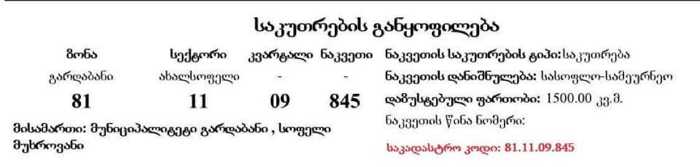 სასწრაფოდ იყიდება 2900 კვ.მ სასოფლო-სამეურნეო მიწისნაკვეთი