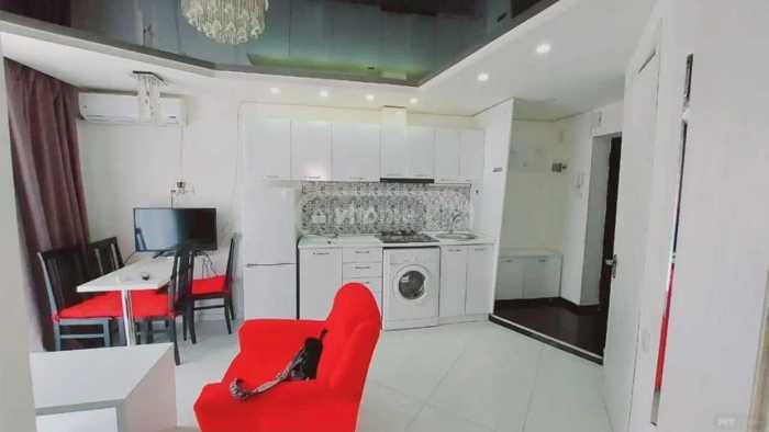 სრული ავეჯით და ტექნიკით, ბინა მდებარეობს მოდულის შენობის წინ
