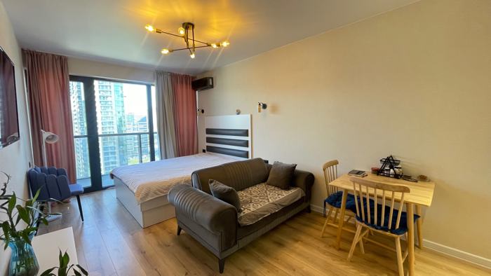 ყიდი სტუდიას Blue sky towers-ში, თბილისის აბუსარიძის 14-ზე 23-ე მაღალზე 32 მ² ტექნიკა, სითბო გმირების ალეაზე ხედით ფასია 68000$