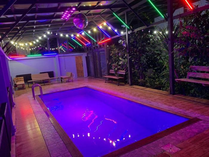 სახლი მდებარეობს თბილისის შემოსასვლელში მცხეთის მხრიდან, აღმაშენებლის ხეივნის დასაწყისში, მუხათგვერდის აგარაკებზე. მუსიკაზე შეზღუდვა არ გვაქვს, ბერინგერის 1000 ვატიანი დინამიკით შეძლებთ ისარგებლოთ მთელი ღამე. დამატებითი დინამიკის შემოტანა აკრძალულია. სახლს აქვს 3 საძინებელი, მისაღები, სამზარეულო, დახურული აუზი, რომელიც თბება 38 გრადუსამდე, გვაქვს დიდი საცეკვავო დარბაზი კლუბური განათებებით, მაგიდებით და სკამებით 50 ადამიანამდე. ასევე არის დიდი, ლამაზი, გამწვანებული ეზო, საპარკინგე ადგილები ეზოში, მაყალი და შამფურები მწვადის შესაწვავ ადგილზე და უზარმაზარი ტერასა. შესვლა შეგიძლიათ შუადღის 3 საათიდან, ხოლო გასვლის დრო განსაზღვრულია მომდევნო დღის დილის 12 საათამდე. ფასი ცვალებადია კვირის დღეების და სტუმრების რაოდენობის მიხედვით. ჯავშნების მიღება ხდება წინასწარ. შეგიძლიათ სახლის წინასწარ დათვალიერება, როგორც დეტალური ვიდეოს მეშვეობით, ასევე ადგილზეც.
