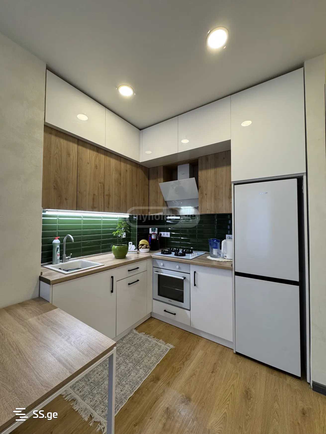 ბინაში არის ავეჯი/ტექნიკა, ინტერნეტი( WiFi) კონდიციონერი, ცენტრალური გათბობის სისტემა, სამზარეულოს ტექნიკა, ტელევიზორი, სარეცხი მანქანა, რკინის კარი, აივანი, ხედი გადის გუდვილზე.
