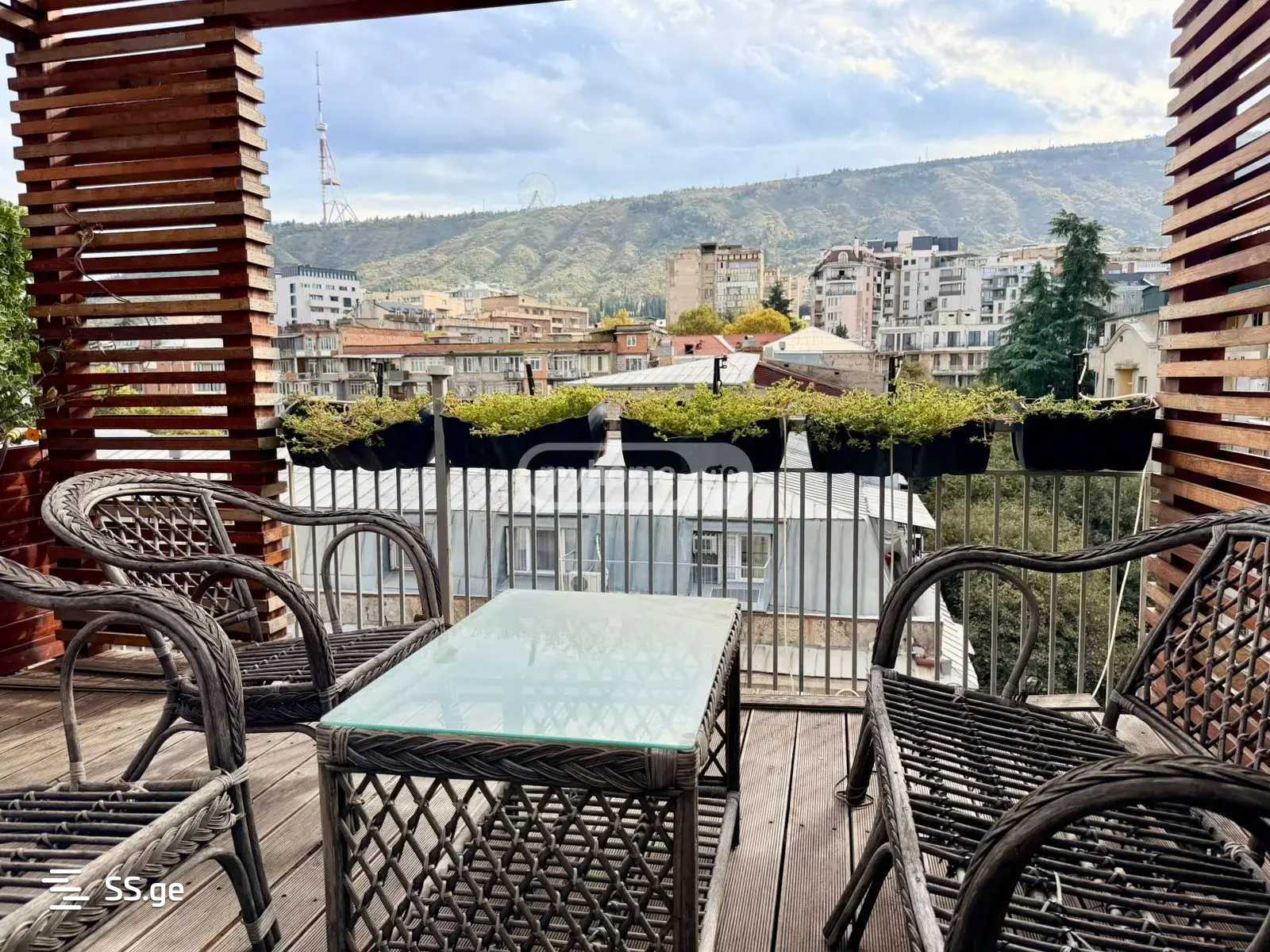 ბინას აქვს განსაკუთრებულად დიდი, 90-გრადუსიანი ტერასა, რომელიც გადაჰყურებს მთაწმინდას 🌇