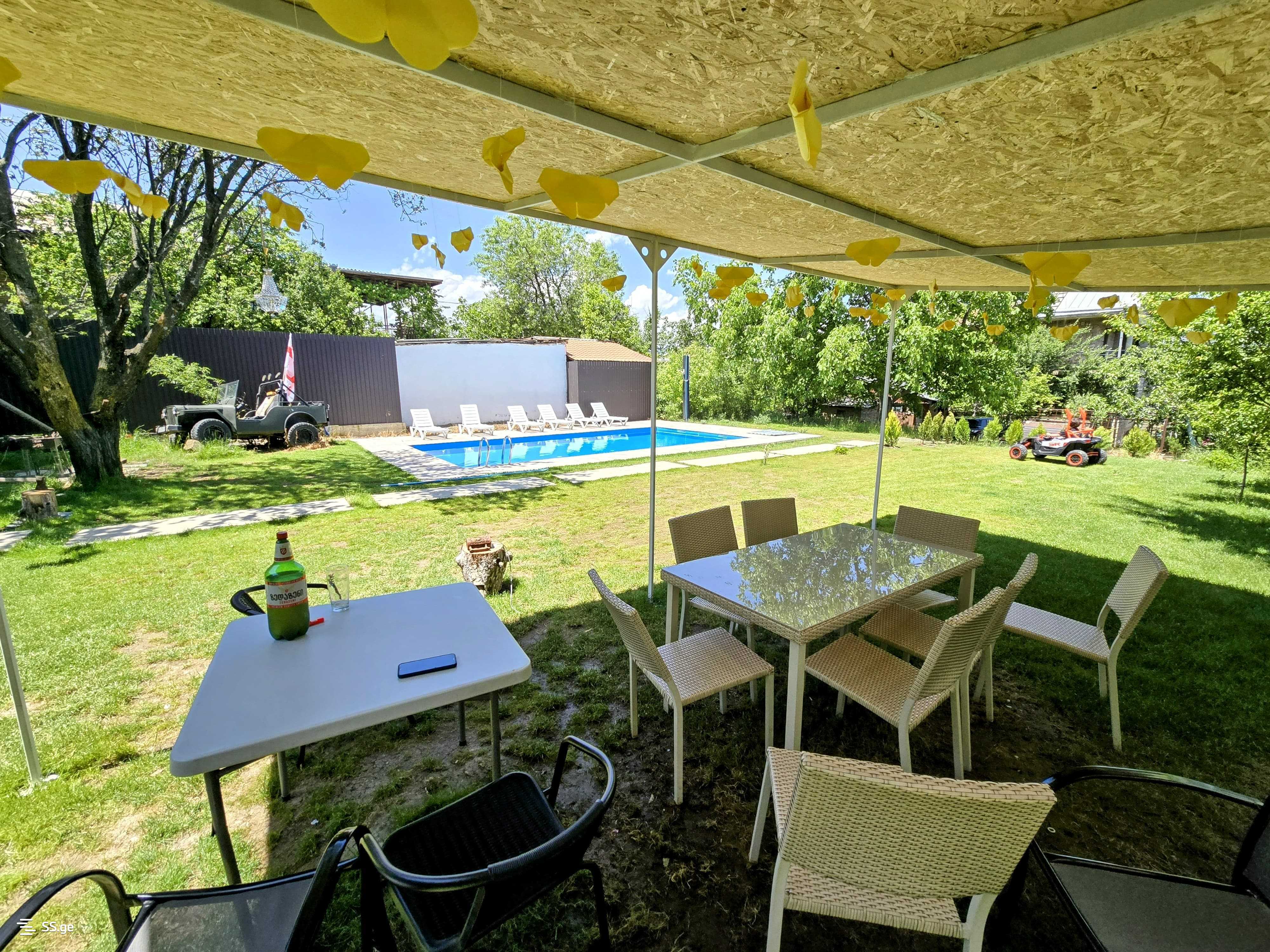 ეზოში არის დიდი ფანჩატური, ფურშეტის მაგიდები და ეზოს სკამები....