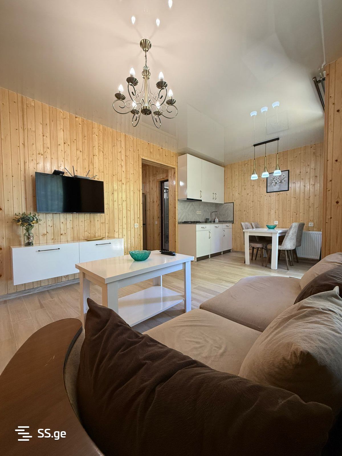 70 კვ.მ, 2 სართულიანი, მისაღები სტუდიო, 2 საძინებლით (მე-2 სართულზე), 2 სველი წერტილით, ფრანგული აივნით.