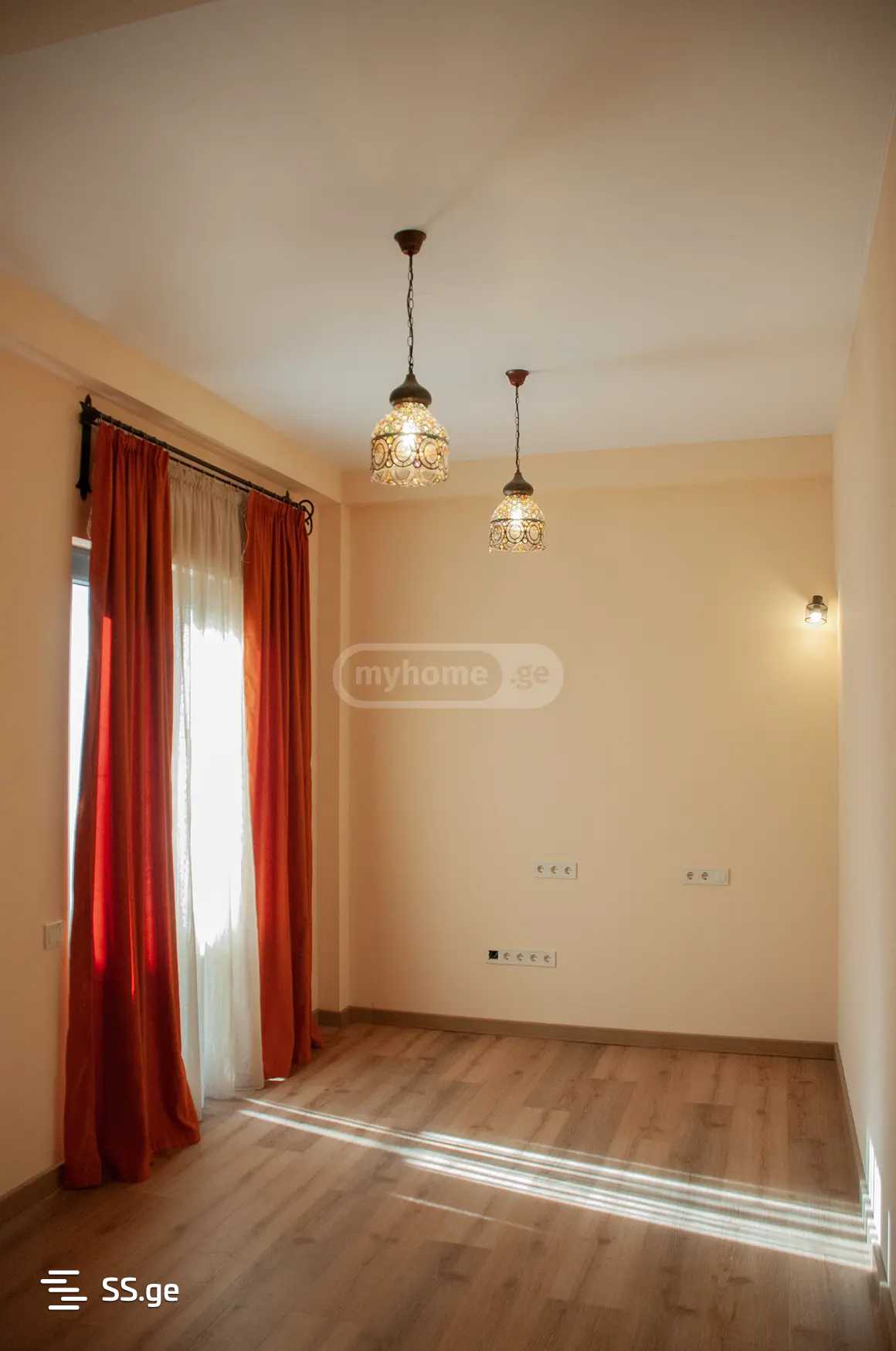 ქირავდება ახალი, უცხოვრებელი ეზოიანი სახლი თხინვალაში (ლისის ტბის მიმდებარედ, ზალდასტანიშვილისა და ბრიტანულ სკოლასთან ახლოს). თითოეული სართული 100 კვ. მეტრია. 1 სართულზე განთავსებულია ამერიკული ტიპის გახსნილი სამზარეულო, სასტუმრო ოთახი და 1 ოთახი (გამოდგება კაბინეტად, საძინებლად ან ბავშვების ოთახად). ასევე, 1 შხაპიანი აბაზანა-ტუალეტი და 1 პატარა ტუალეტი. დამხმარე ფართებია პროდუქტების საკუჭნაო, პალტოებისა და ფეხსაცმლის გარდერობი, სამრეცხაო (სარეცხი მანქანა და საშრობი)+ტექნიკური ოთახი, შესაბამისი უჯრებითა და თაროებით. აბაზანაში არის კიდევ დამატებითი სათავსო. სამზარეულო აღჭურვილია ავეჯითა და ყველა საჭირო ტექნიკით (გაზქურა გამწოვით, მიკროტალღური ღუმელი, ღუმელი, ჭურჭლის სარეცხი მანქანა, მაცივარი და ღვინის მაცივარი). სასტუმრო ოთახში დგას მაგიდა სკამებით, ტახტი სავარძლებით, ტელევიზორი თავისი მაგიდით და ანტიკვარული ბუფეტი. შემოსასვლელში დაგხვდებათ საკიდი კარადით. შესაბამისი ავეჯია აბაზანა-ტუალეტშიც. სამზარეულოდან აივანზე გადის 2 დიდი ვიტრაჟული კარი, რის გამოც სახლი მუდამ ნათელია, ხოლო გარეთ სასიამოვნო სასადილო, სამუშაო თუ მოსასვენებელი სივრცე მოეწყობა. მეორე სართულზე არის 1 მასტერ საძინებელი და 3 ოთახი. ავეჯი აქ არ დგას. მოქირავნე შეძლებს სურვილისამებრ და საკუთარი დანიშნულების შესაბამისად მოაწყოს თითოეული მათგანი. სამ ოთახს თავისი საგარდერობე ოთახი აქვს, ასევე თაროებითა და უჯრებით მოწყობილი. არის კიდევ ერთი მოზრდილი აბაზანა, სადაც ორი ნიჟარაა მოთავსებული. 3 ოთახი გადის აივანზე, ხოლო მეოთხე - უკანა ეზოში. მეორე სართულიდან კიბე ადის ბრტყელ სახურავზე, სადაც ბანია მოწყობილი, ლამაზი ხედები იშლება ოთხივე მხარეს და მუდამ უბერავს სასიამოვნო სიო. სახლი არის ფერადი, თბილი, ნათელი და ხალისიანი. გარემონტებულია ვინტაჟურ სტილში, ეკლექტური ელემენტებით. ყველა ოთახში არის ჭაღი და ფარდები. ორივე სართულზე არის იატაკქვეშა გათბობა. თითოეული კუთხე დაცულია კამერებითა და მოძრაობის დეტექტორებით. ეზოში შესასვლელად დამონტაჟებულია ელექტროჭიშკარი. ეზოს ფართობია 300 კვ.მ. ფერდობული ეზო სტრუქტურირებულია 3 ტერასად. პირველი დონიდან შევდივართ სახლში, აქვე გამოვდივართ სამზარეულოდან. მეორე, პატარა ტერასა სახლის გვერდითაა და აქედან ავდივართ უკანა ეზოში (სადაც მეორე სართულიდანაც გავდივართ). სახლის გვერდით დგას წყლის ტონიანი რეზერვუარი, რომელიც გამოიყენება წყლის დაწყვეტის შემთხვევაში. სახლი მდებარეობს გორის ძირში და უკან არაფერი უდგას, რის გამოც მეტად მყუდ