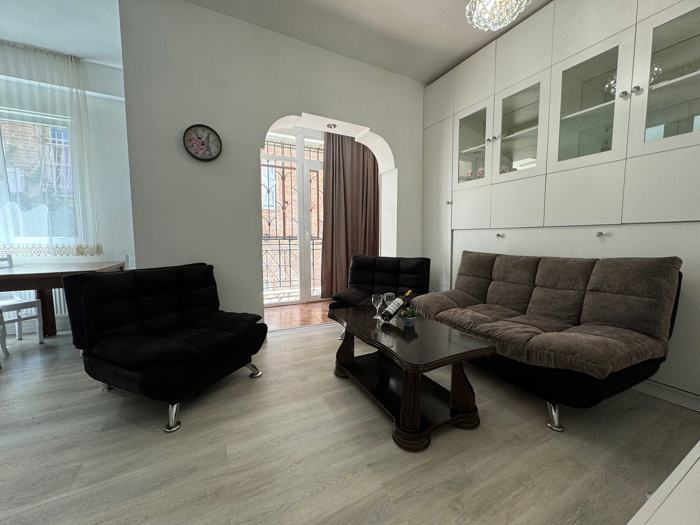 For sale an apartment on Plekhanov Street, in a newly built building near the Russian church. The apartment is suitable for both living and commercial purposes, located on the first floor without stairs. There are commercial spaces and a hotel on the lower floors. The apartment also has the potential to expand from approximately 20 sqm to 25 sqm. The apartment is currently rented. If desired, the furniture and appliances can remain. For more information, contact me at 599 91 97 98. I am the owner.