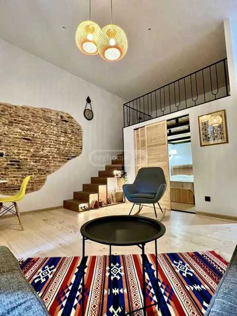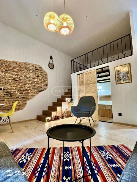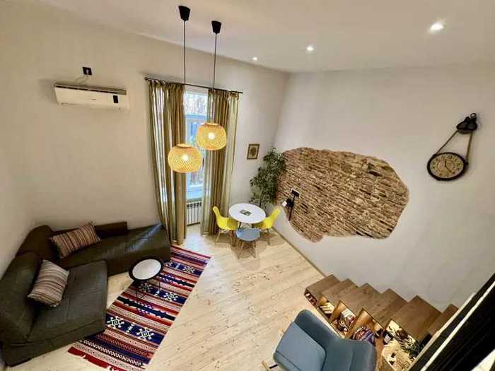 თაბუკაშვილის ქუჩაზე N14, წყნარ ეზოში ისტორიულ კულტურული მემკვიდრეობის სტატუსი მქონე სახლში ქირავდება დუპლექსის ტიპის ახალ გარემონტებული ბინა, სრულად აღჭურვილი, ჭურჭლის სარეცხი მანქანა, ქვევით არის საძინებელი 2 ადგილიანი საწოლით და ასევე ზედა სართულზე 2 ცალი ერთ ადგილიანი საწოლები.