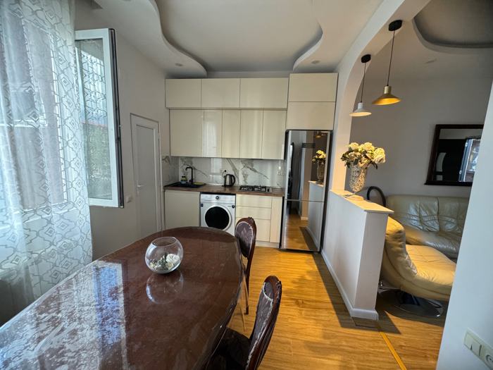 ვარ მესაკუთრე. ქირავდება ბათუმში ახალგარემონტებული სამოთახიანი ბინა (70მ) ღია ვერანდით (50მ) და დახურული აივნით (10მ) ჯავახიშვილის ქუჩაზე აგროჰაბთან ორსართულიანი სახლის მეორე სართულზე. მზიანი, ნათელი, მყუდრო ბინა. ორი ნათელი საძინებელი. კეთილმოწყობილი სამზარეულო. კარგი რემონტი, ცენტრალური გათბობა, კონდიციონერი, სმარტ ტელევიზორი, მაცივარი, გაზქურა, სარეცხი მანქანა, ინტერნეტი. ბინაში დაგხვდებათ თეთრეული. სახლში სულ არის 4 იზოლირებული ბინა. ყველა ბინა თავისი სამზარეულოთი და აბაზანით. წყნარი, მშვიდი, მოწესრიგებული გარემო. კედლები ბეტონის. ჯავახიშვილის 60.