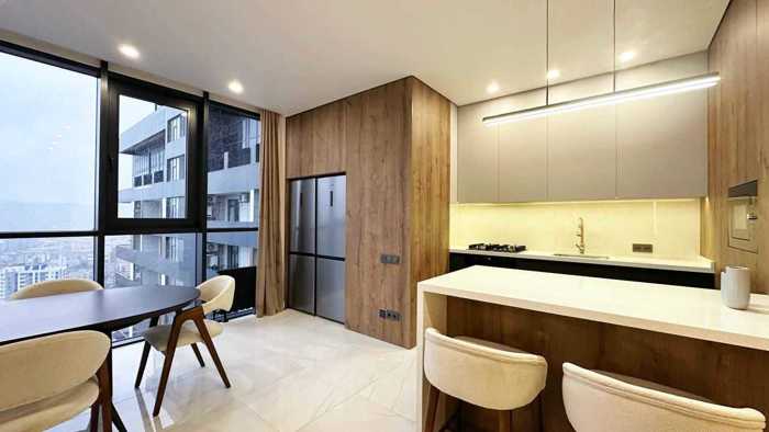 ქირავდება 2 თვით საზაფხულო სეზონამდე! ქირავდება სტუდია ფიროსმანის 17-ში. ბინა არის 39.4 კვ.მ ფართობის და მდებარეობს 35-ე სართულზე. არის დიდი რაოდენობით სათავსო ადგილები. კომფორტისთვის ბინა აღჭურვილია გაზის გათბობით და წყლის თბილი იატაკის სისტემით. ბინა სრულად არის აღჭურვილი თანამედროვე Midea-ს საყოფაცხოვრებო ტექნიკით: • კონდიციონერი • მტვერსასრუტი • სარეცხი და ჭურჭლის სარეცხი მანქანები • მიკროტალღური ღუმელი გრილით • ქურა • მაცივარი • ფენი • უთო • Wi-Fi დივანი იშლება დამატებით საძილე ადგილად (80x190 სმ). შესაძლებელია ცხოველებთან ერთად ცხოვრება.