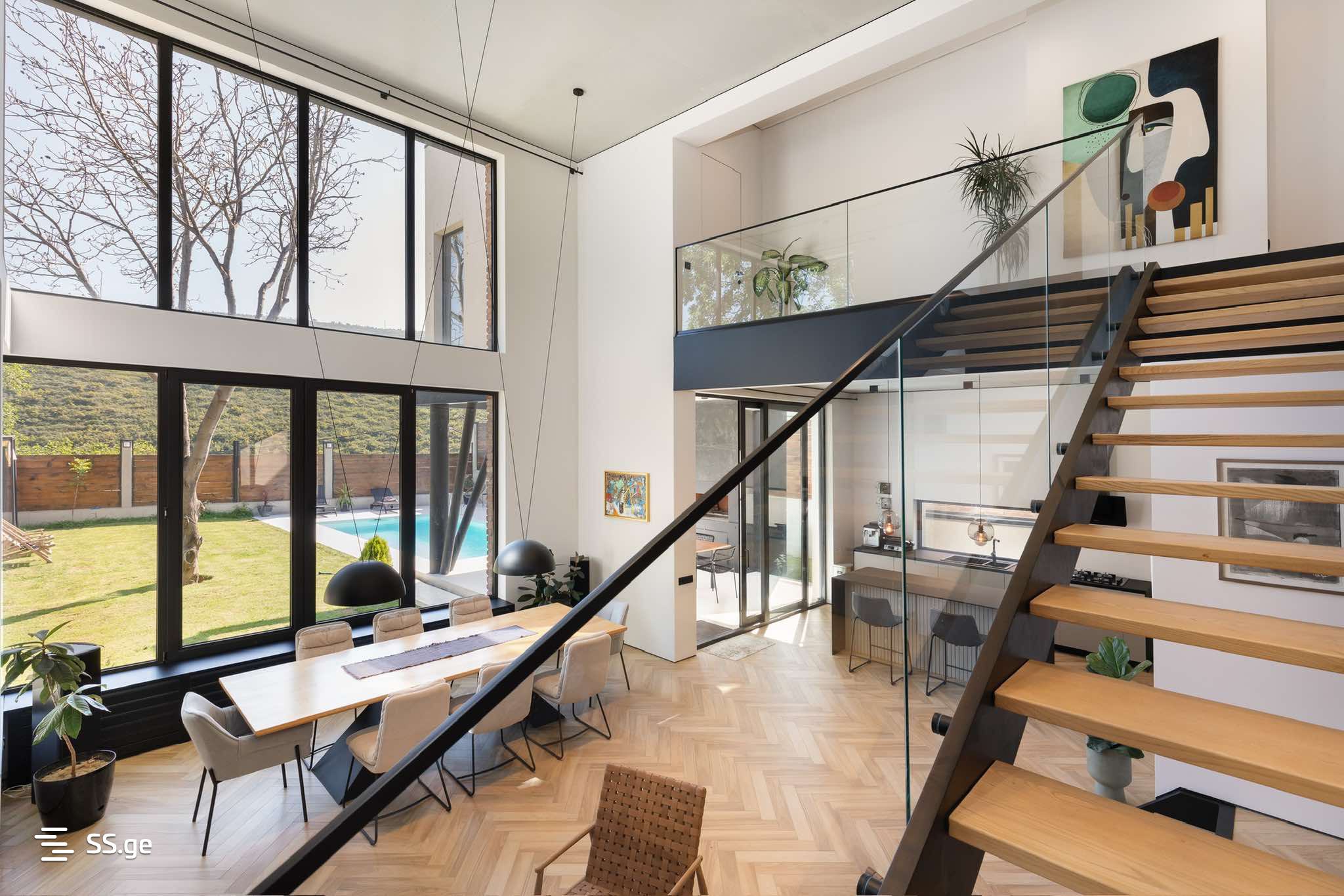 Общая площадь составляет 330 м2 и включает в себя студию типа гостиная и кухню, 3 мастер-спальни, 1 кабинет, который при желании можно превратить в четвертую спальню, 2 гардеробные, сауну и 2 камина (в доме и во дворе).