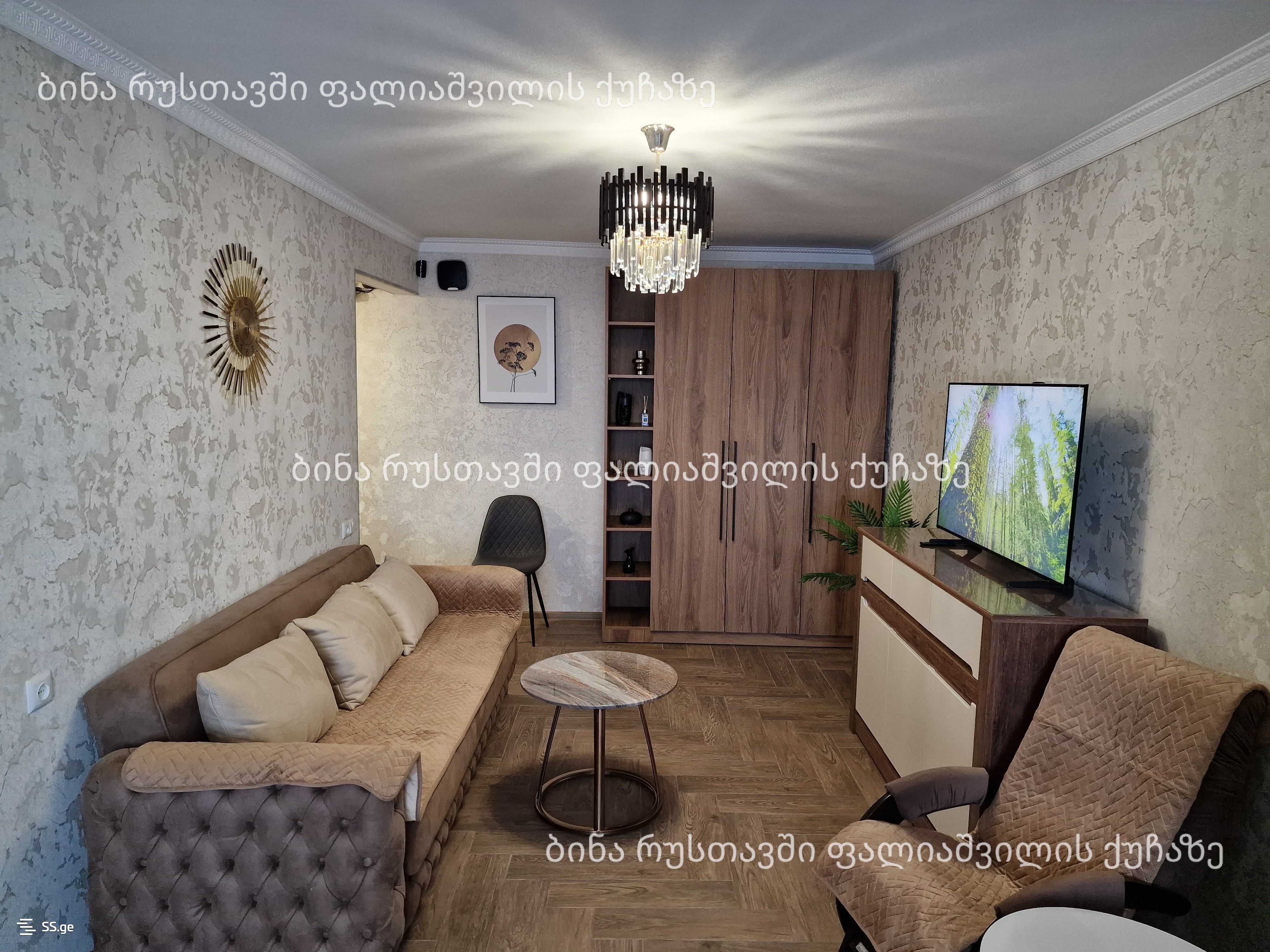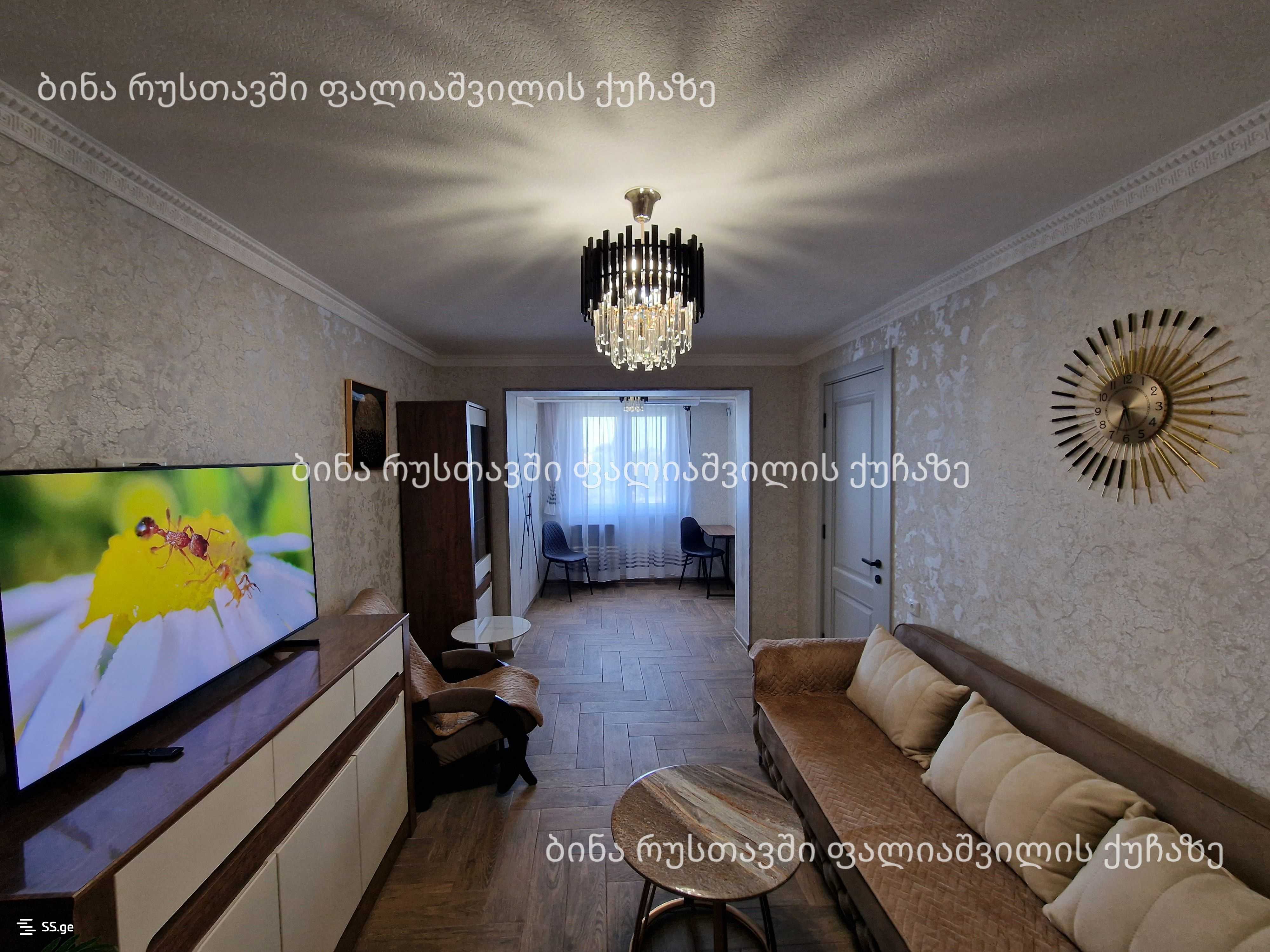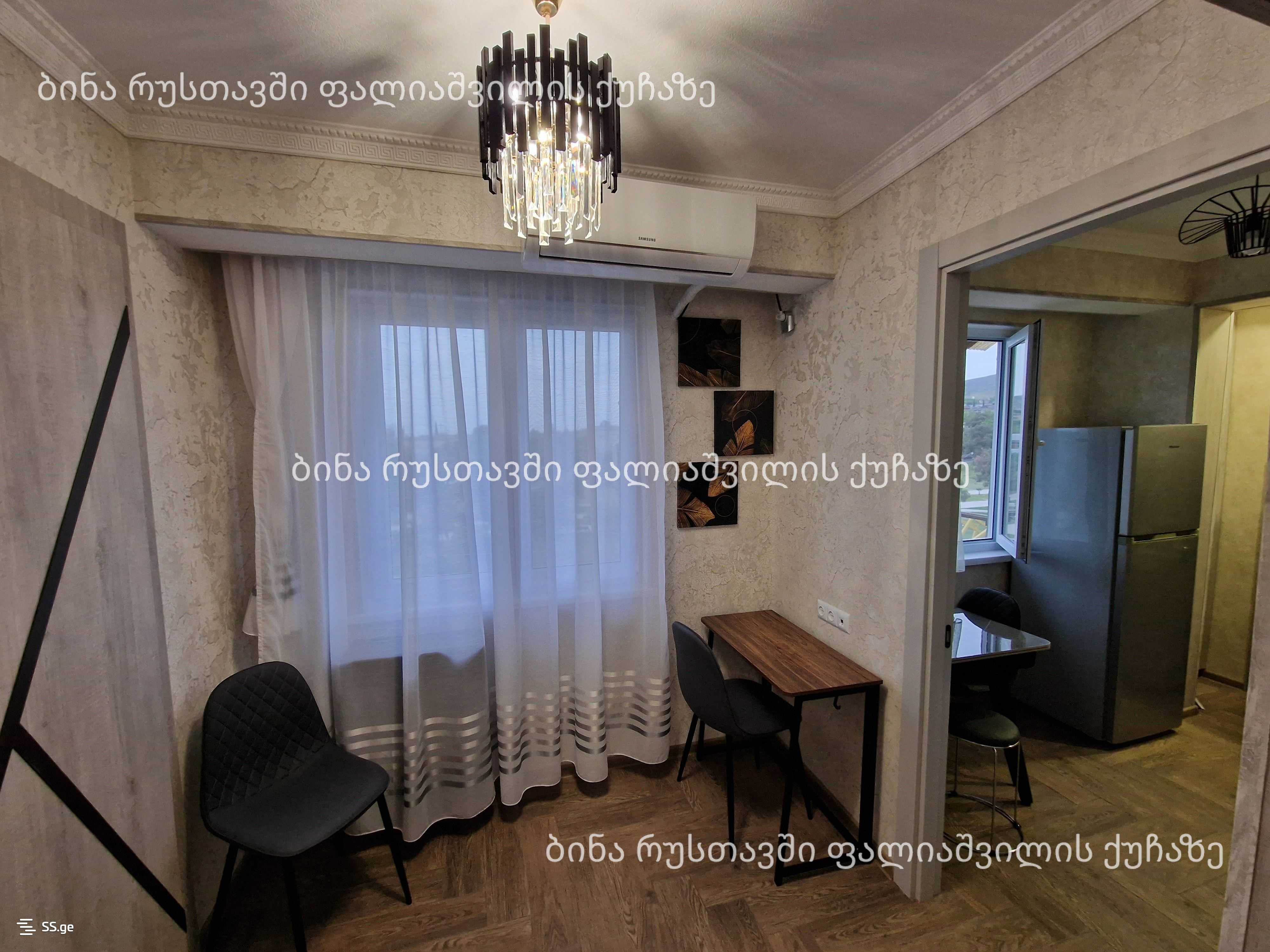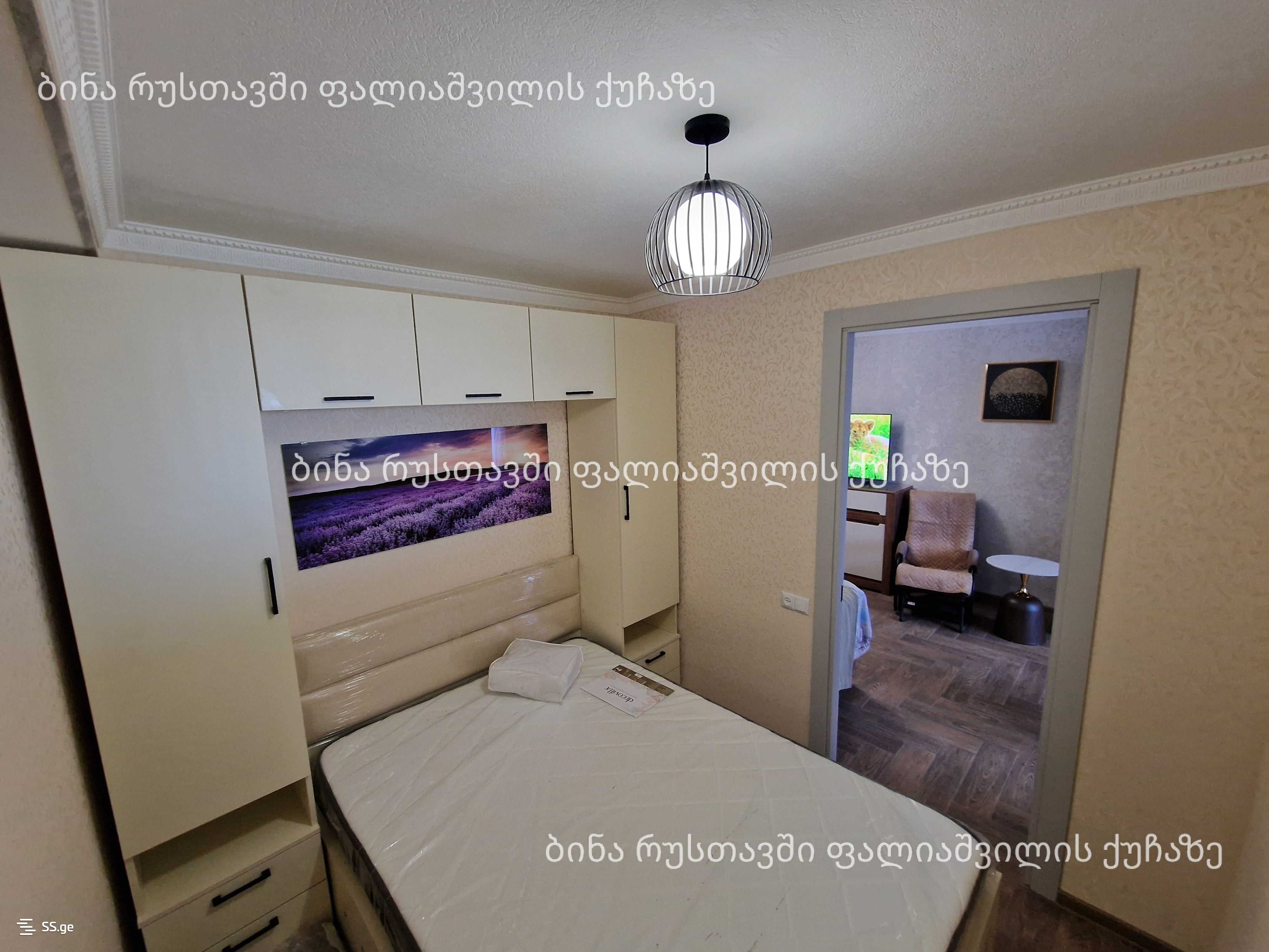 Сдается в Рустави, на улице Палиашвили, 2-комнатная (45 квадратных метров) новая отремонтированная и обставленная квартира с красивым видом, изолированной кухней и спальней. В квартире новая мебель и техника чешская КАРМ, кондиционер, стиральная машина, телевизор, вытяжка, холодильник, микроволновая печь, пылесос и утюг. В квартире есть 500л бак для воды и охрана. Сдается на срок не менее 1 года. Цена 1000 лари и депозит 1000 лари. Тел: 595433714; 558543196