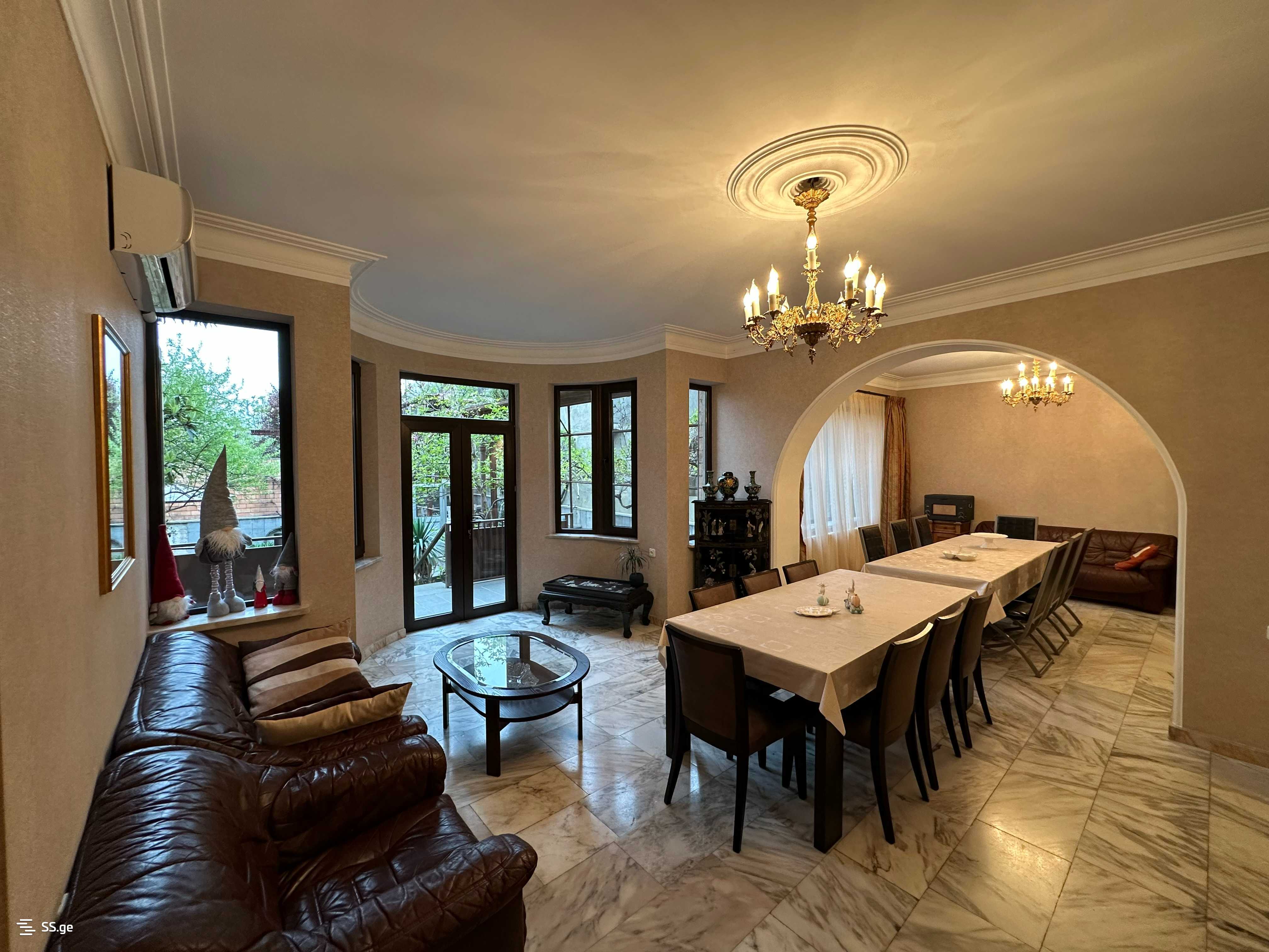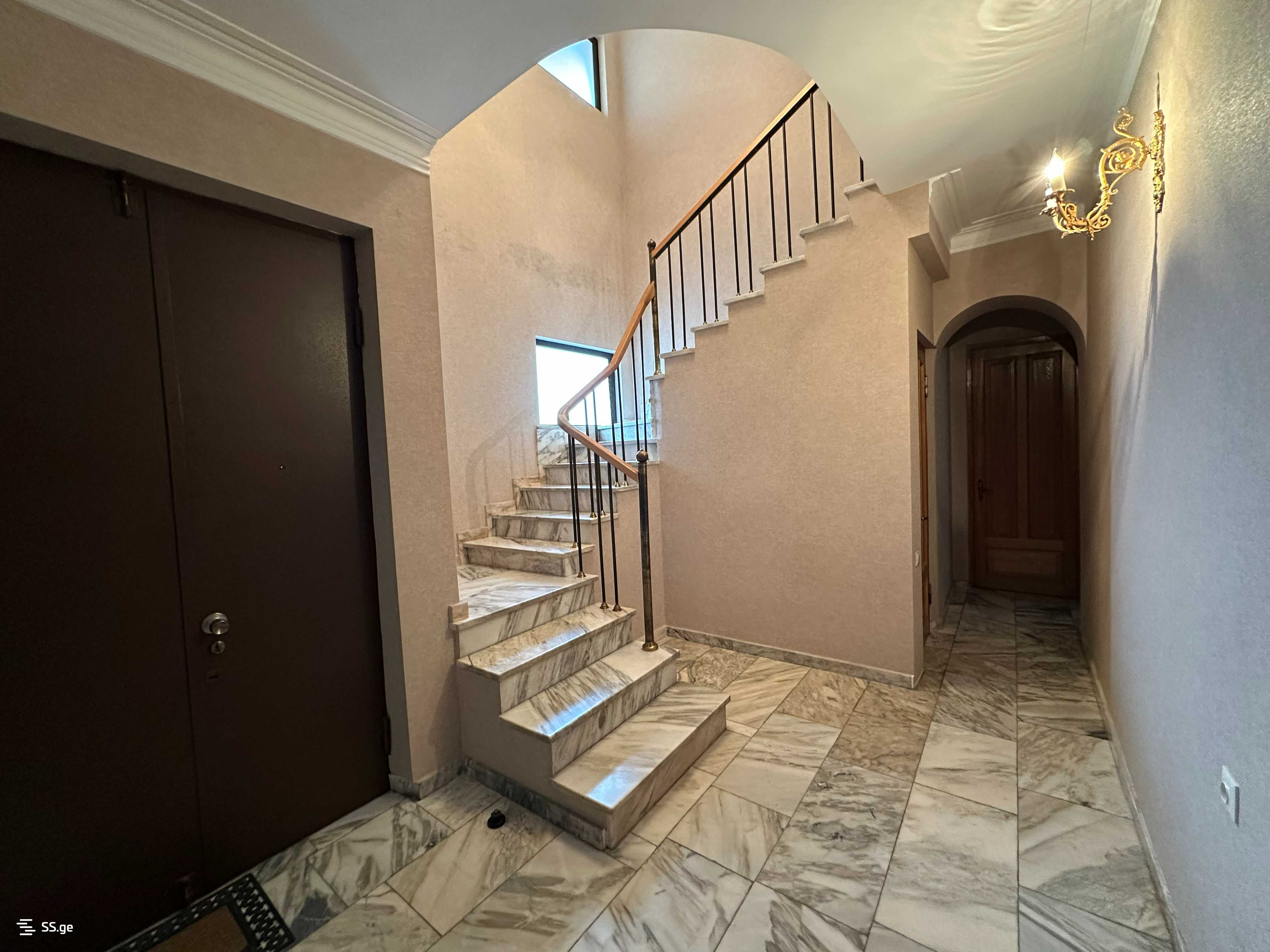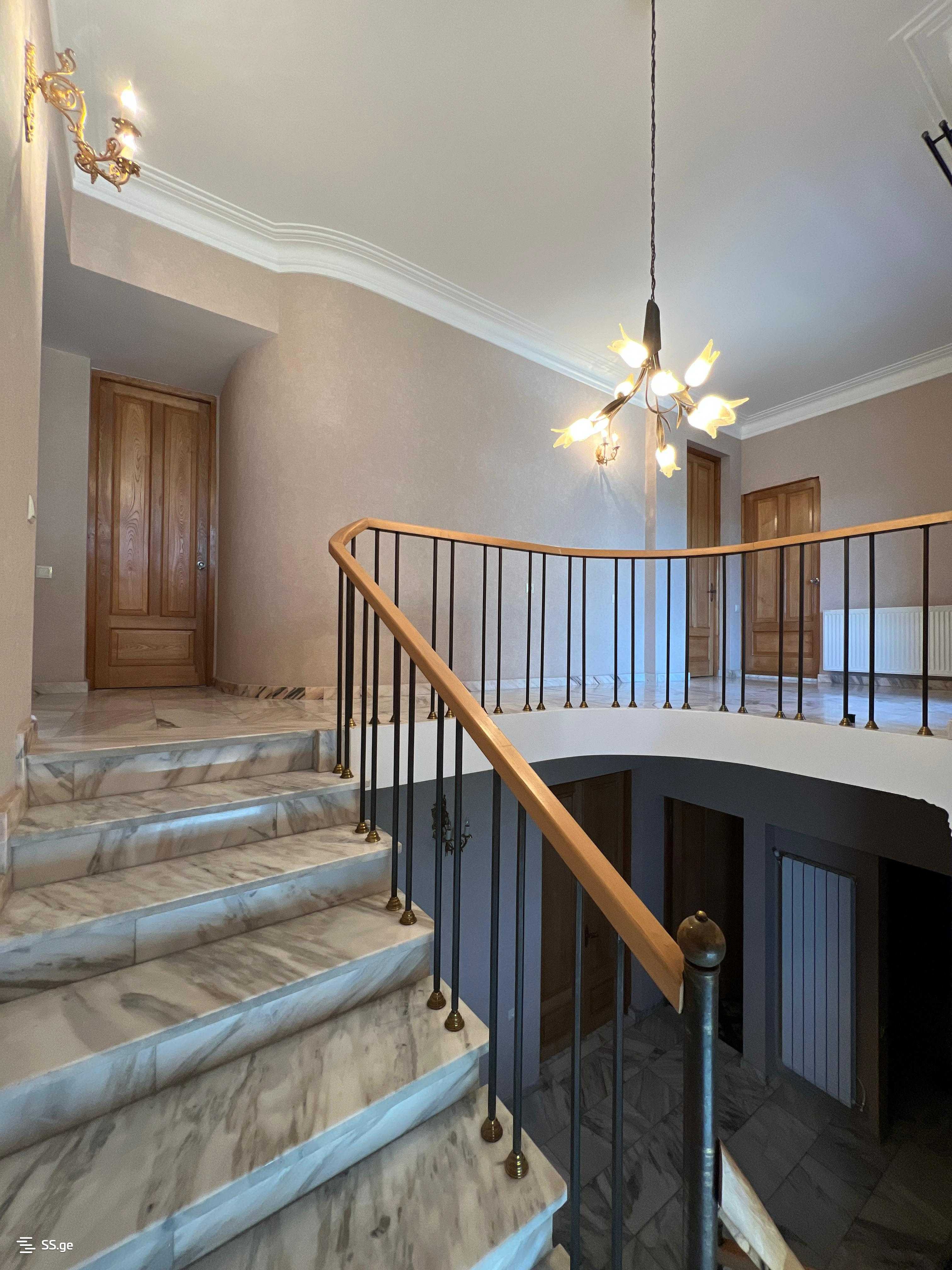 В доме 10 комнат, в том числе: 5 спален, 3 ванных комнаты (сантехника для четвертой ванной комнаты проведена и можно добавить), 2 кухни, 4 камина (два из которых полностью отделаны мрамором, и во всех четырёх подведён природный газ, соответственно работает как на дровах, так и на газе), гараж на 2 больших внедорожника, встроенные шкафы, подвал, капитально отремонтированный с 6 комнатами. По всему дому на полу уложен толстый ценный мрамор, только в спальнях паркет из дуба. Двери и окна - коричневые, двойные, металлические.