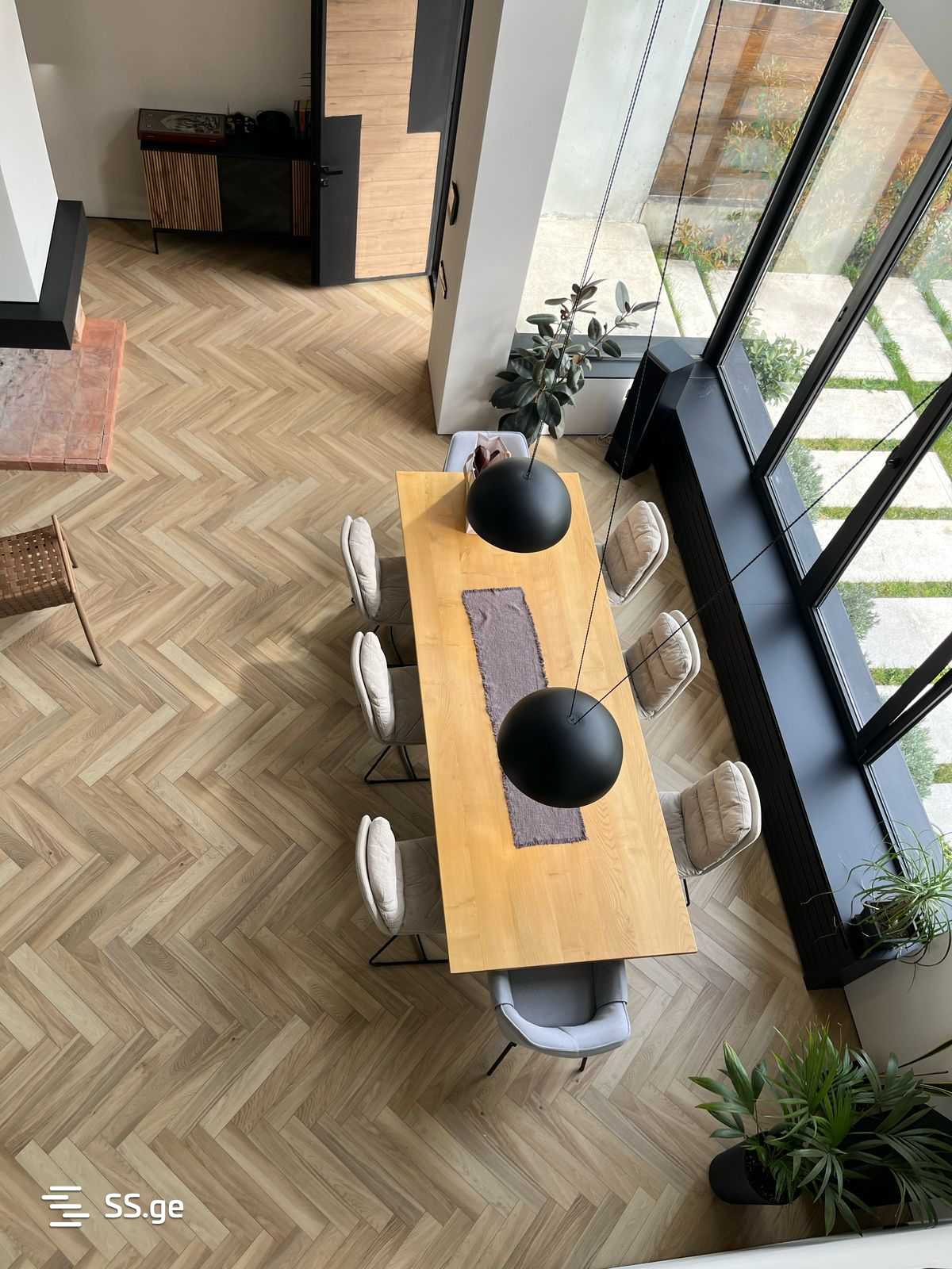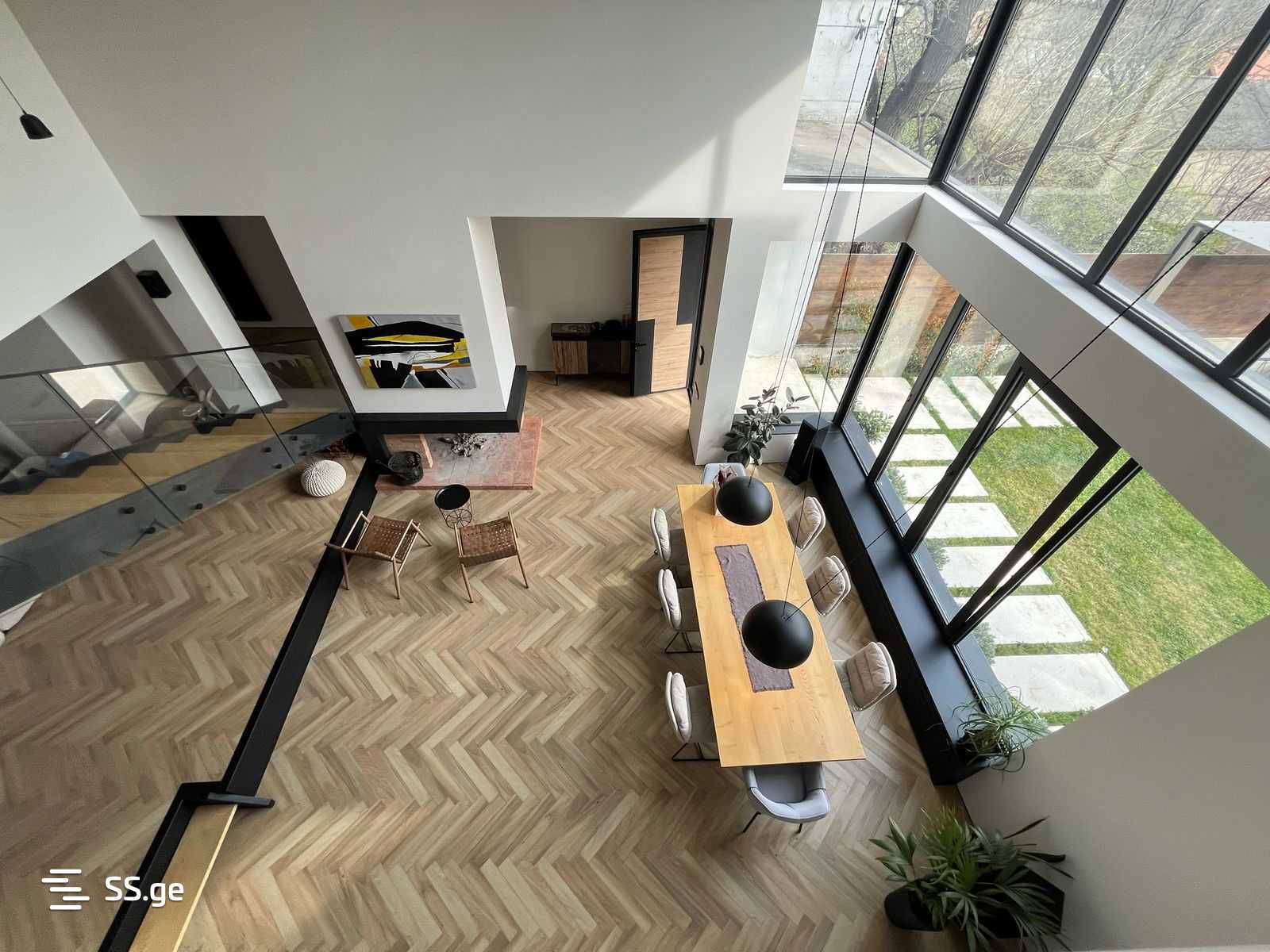 На первом этаже расположены 1 большая гостиная-студия и кухня, 1 санузел, 1 техническое помещение, 1 кладовка, 1 развлекательная комната и 1 гостевой санузел.